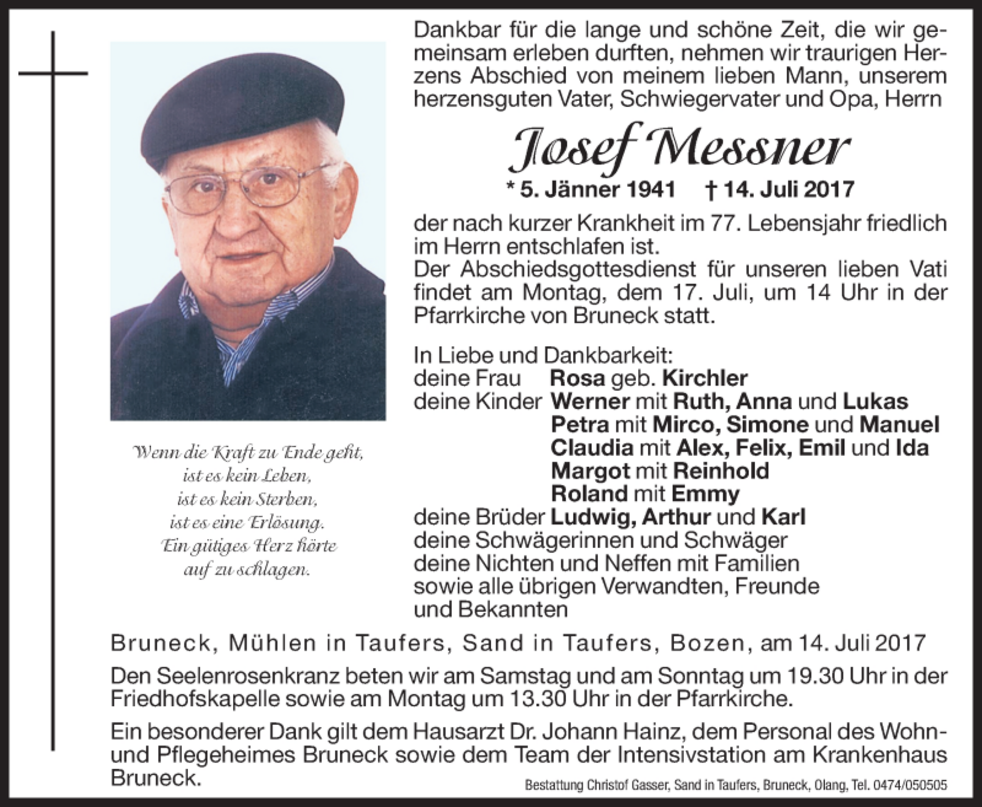 Der Abschiedsgottesdienst für unseren lieben Vati findet am Montag, dem 17. Juli, um 14 Uhr in der Pfarrkirche von Bruneck statt. Anschließend begleiten wir ihn zur letzten Ruhe in den Friedhof.