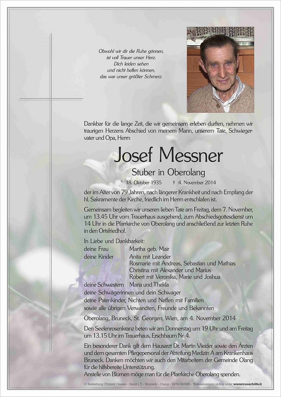 Ein besonderer Dank gilt dem Hausarzt Dr. Ulrich Plaikner und den Sprengelschwestern für die liebevolle Betreuung und Begleitung.