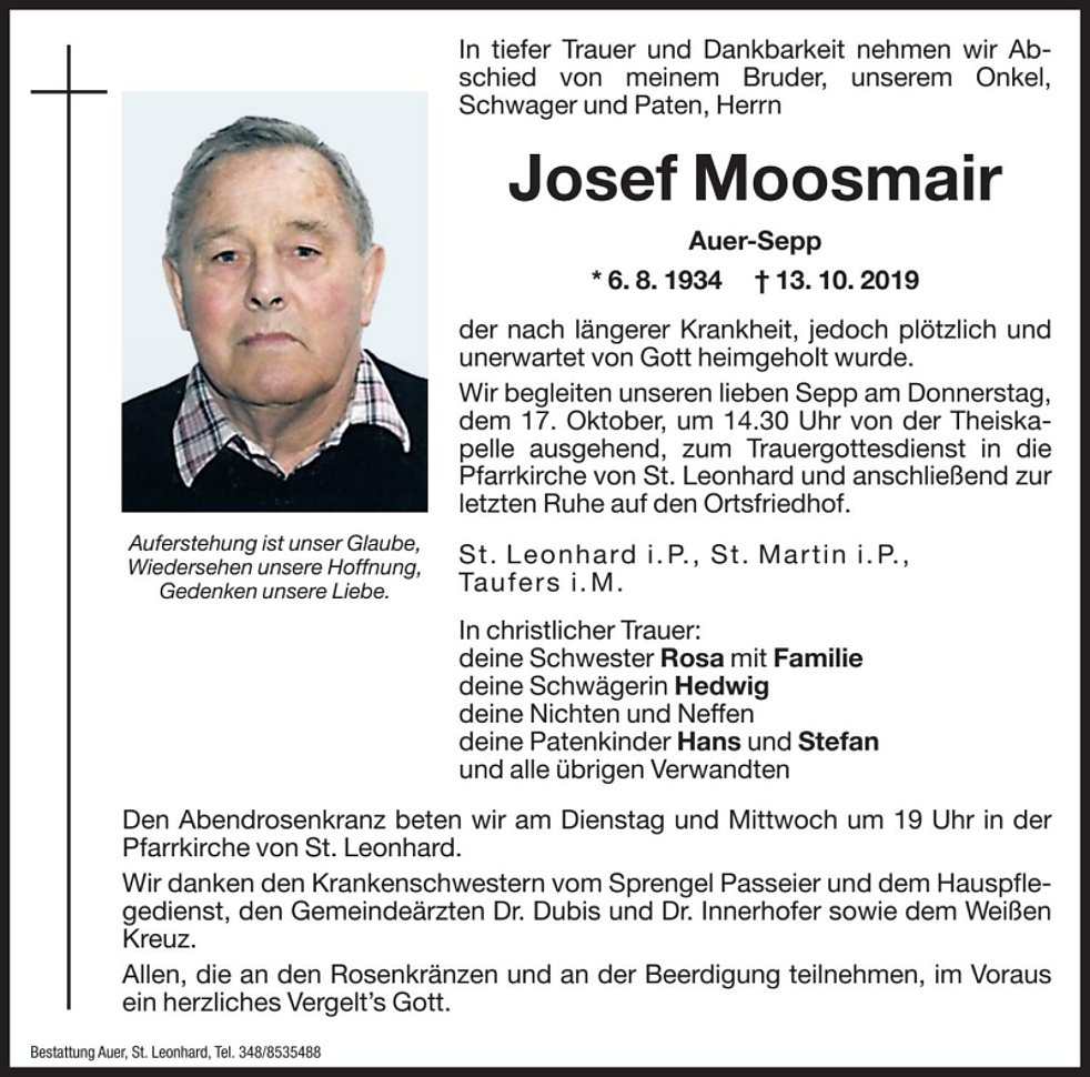 Wir begleiten unseren lieben Sepp am Donnerstag dem 17. Oktober, um 14.30 Uhr von der Theiskapelle ausgehend, zum Trauergottesdienst in die Pfarrkirche von St. Leonhard und anschließend zur letzten Ruhe auf den Ortsfriedhof.