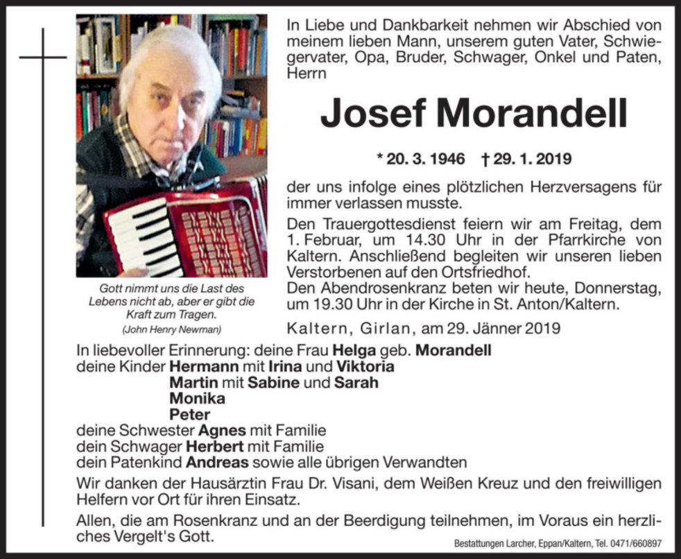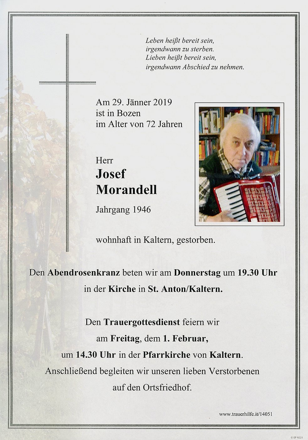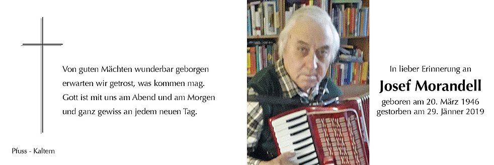 Den Trauergottesdienst feiern wir am Freitag, dem 1. Februar um 14.30 Uhr in der Pfarrkirche von Kaltern. Anschließend begleiten wir unseren lieben Verstorbenen auf den Ortsfriedhof.