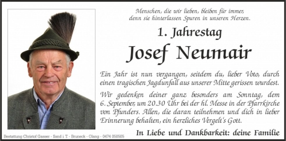 Gemeinsam begleiten wir unseren lieben Voto am Mittwoch, dem 10. September, um 13.30 Uhr vom Trauerhaus ausgehend, auf seinem letzten Weg zum Gottesdienst um 14.30 Uhr in die Pfarrkirche von Pfunders. Anschließend übergeben wir ihn der geweihten Erde.