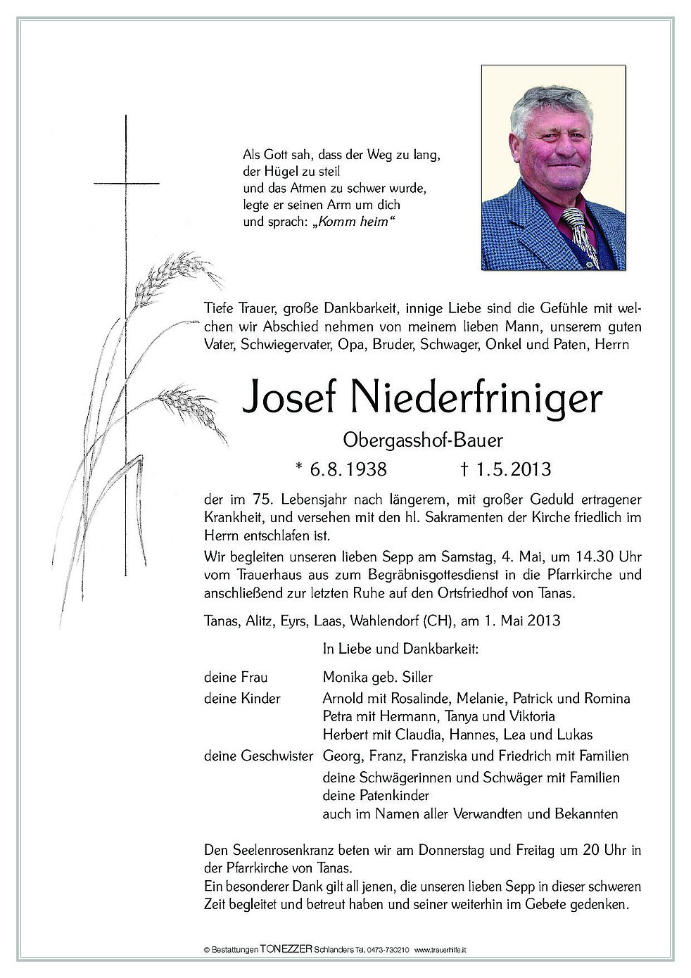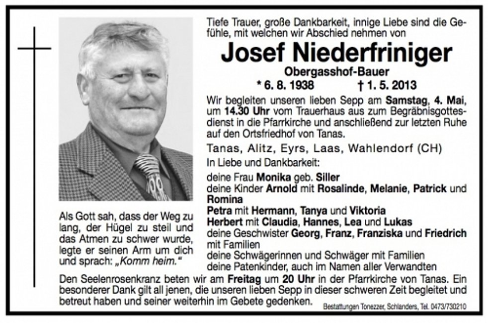 Wir begleiten unseren lieben Sepp am Samstag, 4. Mai, um 14.30 Uhr vom Trauerhaus aus zum Begräbnisgottesdienst in die Pfarrkirche und anschließend zur letzten Ruhe auf den Ortsfriedhof von Tanas.