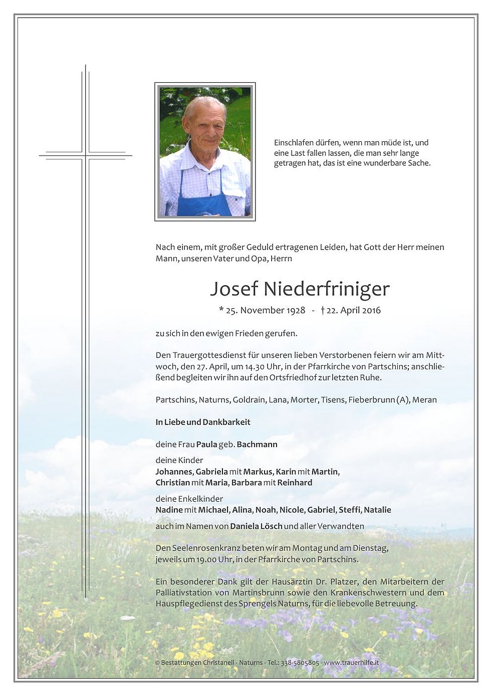 Den Trauergottesdienst für unseren lieben Verstorbenen feiern wir am Mittwoch, den 27. April, um 14.30 Uhr, in der Pfarrkirche von Partschins; anschließend begleiten wir ihn auf den Ortsfriedhof zur letzten Ruhe.