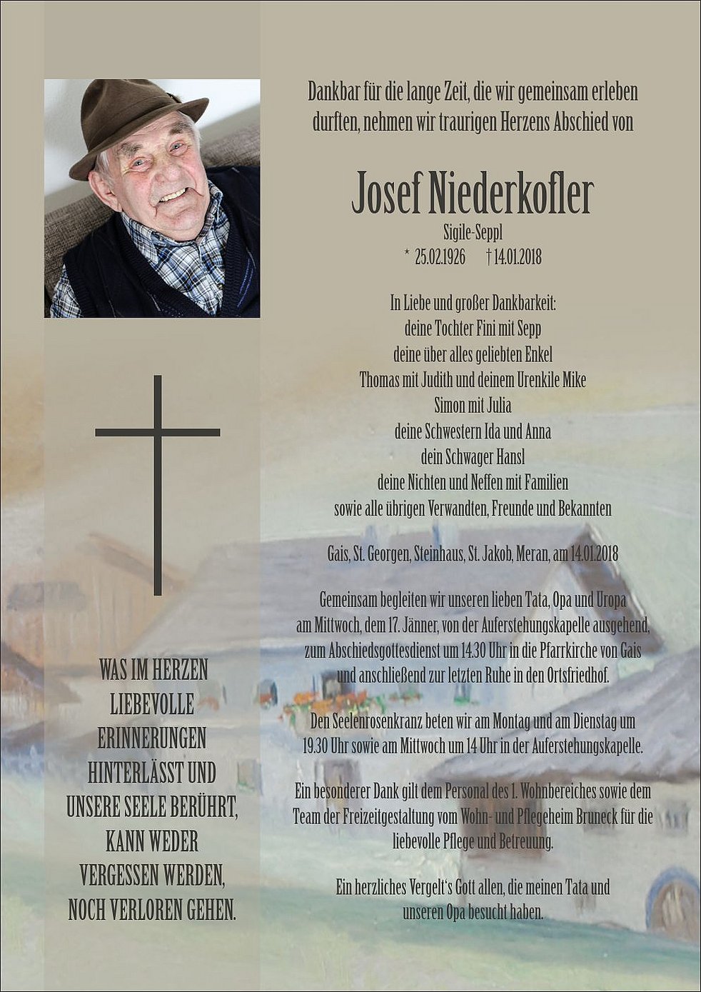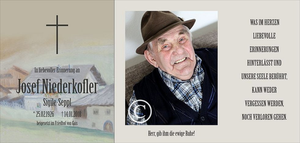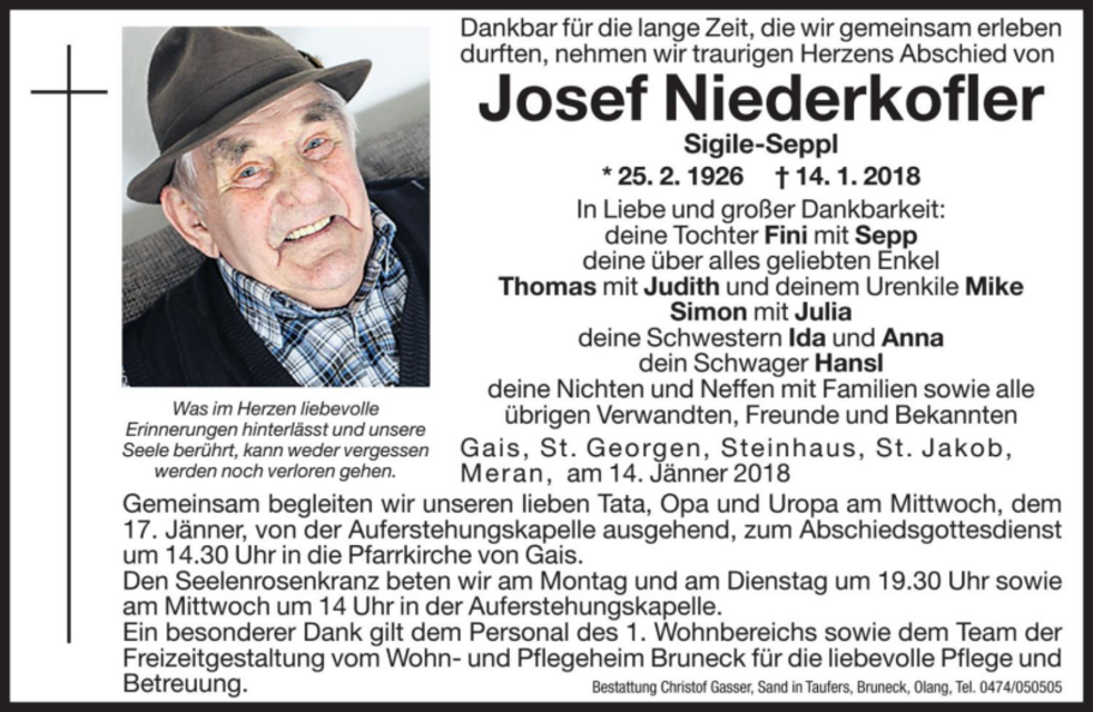 Gemeinsam begleiten wir unseren lieben Tata, Opa und Uropa am Mittwoch, dem 17. Jänner, von der Auferstehungskapelle ausgehend, zum Abschiedsgottesdienst um 14.30 Uhr in die Pfarrkirche von Gais