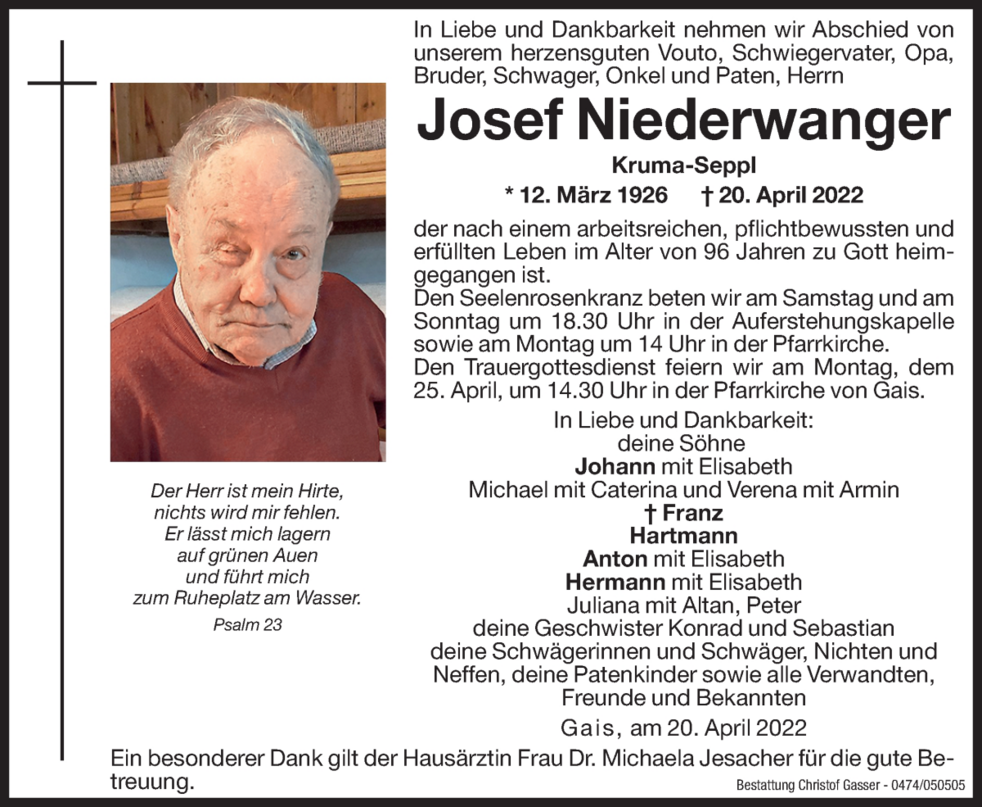 Den Trauergottesdienst feiern wir am Montag, dem 25. April, um 14.30 Uhr in der Pfarrkirche von Gais.