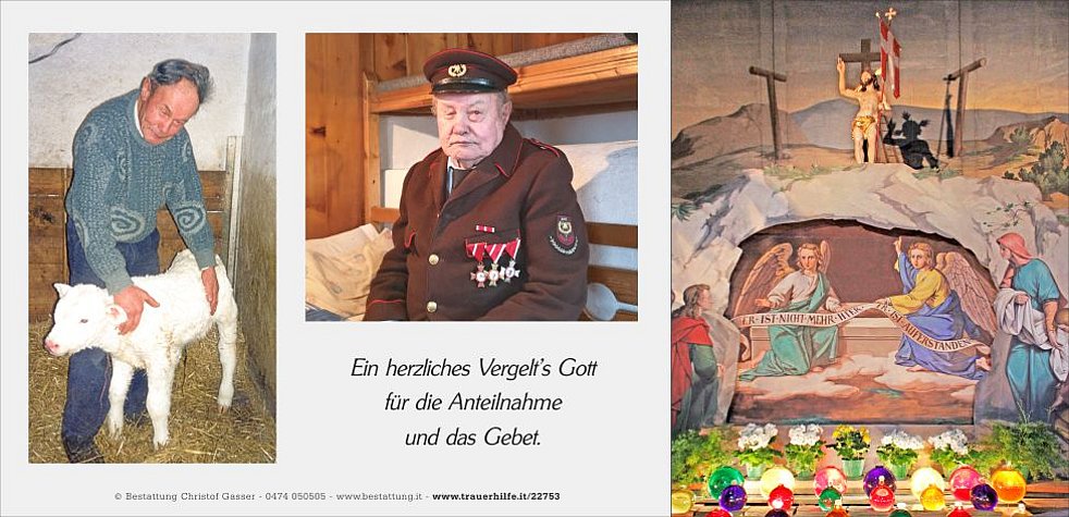 Josef war in Gais 25 Jahre lang als Totengräber tätig, 20 Jahre als Glockenläuter, 60 Jahre hat er die Totenglocke geläutet und beim Auf- und Abbau des Ostergrabes stets beteiligt.