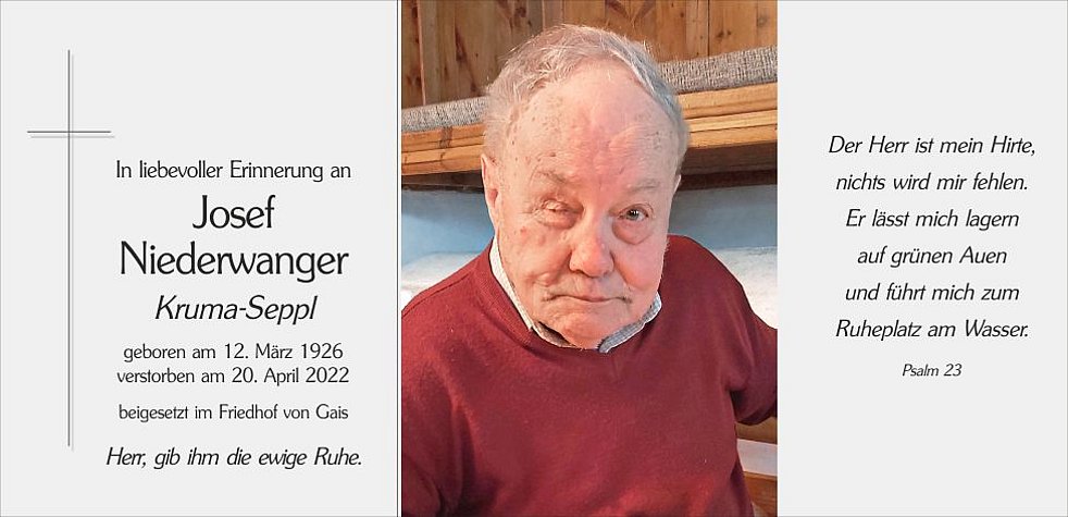 Auch war er Mitglied der FF Gais, und das seit 1945. Do Kruma Seppl war ein bescheidener zufriedener Mensch, Nachbarschaftshilfe für ihn eine Selbstverständlichkeit.