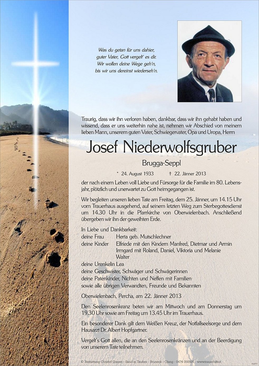 Wir begleiten unseren lieben Tate am Freitag, dem 25. Jänner, um 14.15 Uhr vom Trauerhaus ausgehend, auf seinem letzten Weg zum Sterbegottesdienst um 14.30 Uhr in die Pfarrkirche von Oberwielenbach. Anschließend übergeben wir ihn der geweihten Erde.
