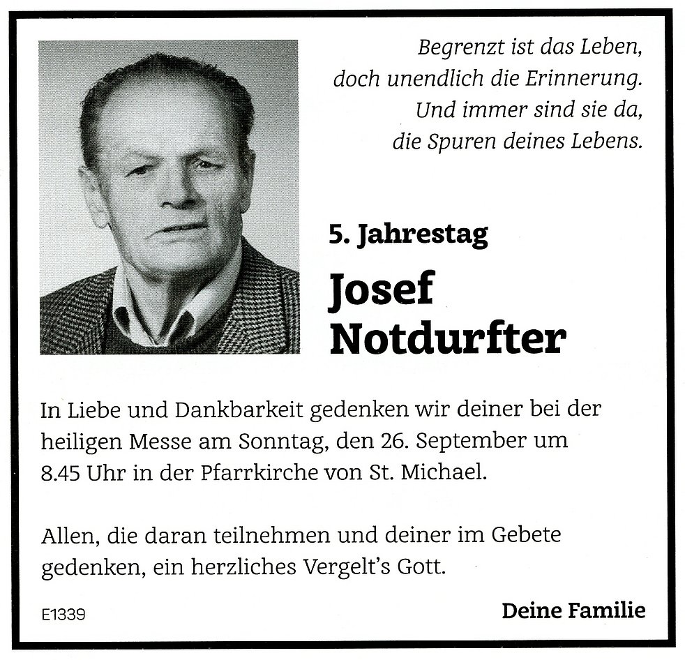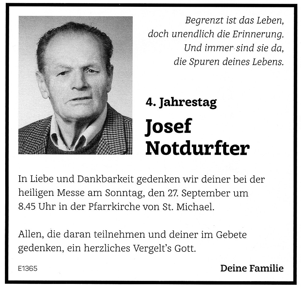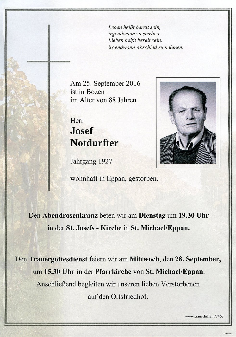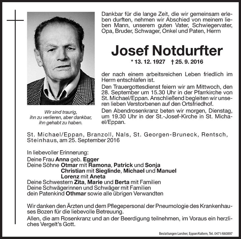 Den Trauergottesdienst feiern wir am Mittwoch, den 28. September um 15.30 Uhr in der Pfarrkirche von St. Michael/Eppan. Anschließend begleiten wir unseren lieben Verstorbenen auf den Ortsfriedhof.