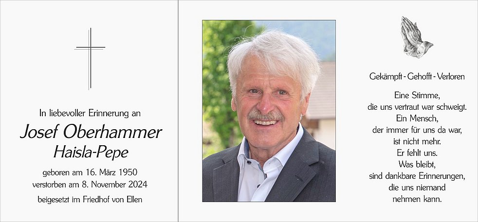 Gemeinsam begleiten wir unseren lieben Tate am Montag, 11. November, um 13.15 Uhr vom Heimathaus ausgehend, zum Abschiedsgottesdienst um 14 Uhr in die Kirche von Ellen und anschließend zur Beisetzung in den Ortsfriedhof.