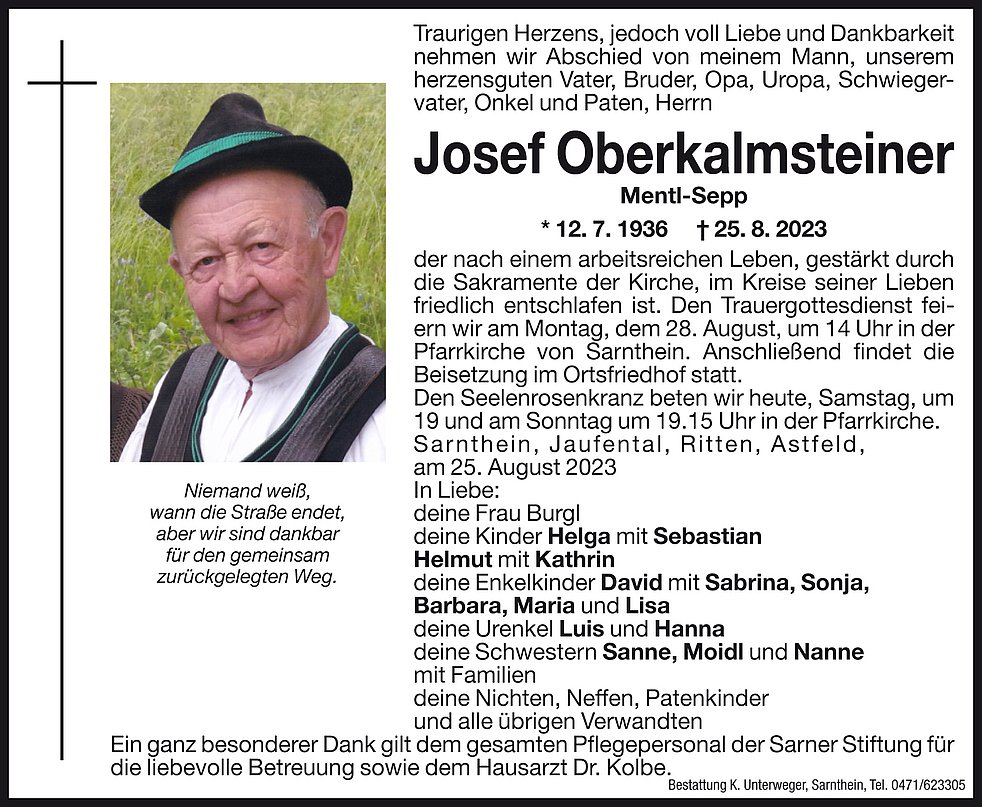 Begräbnisgottesdienst: 28.08. - 14:00 Uhr Pfarrkirche von Sarnthein