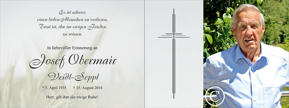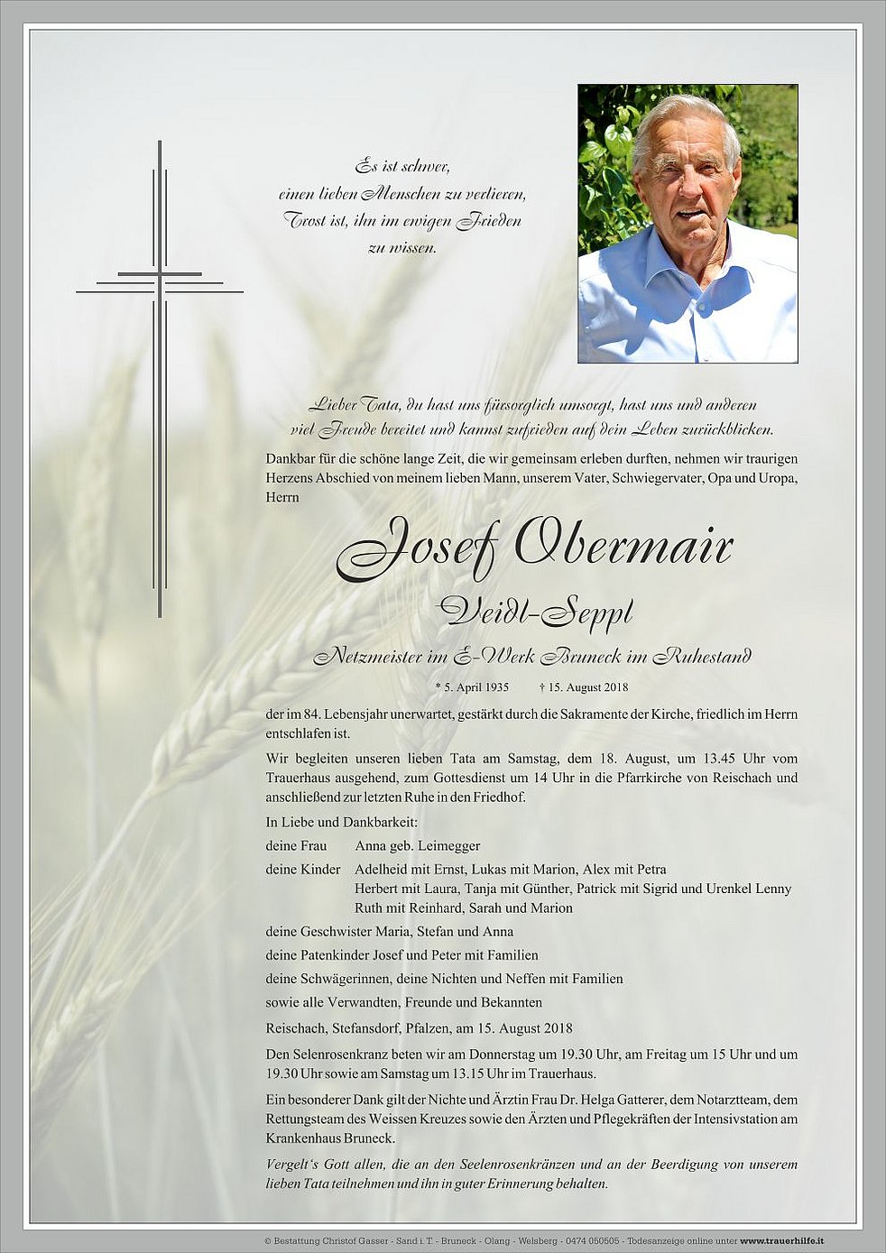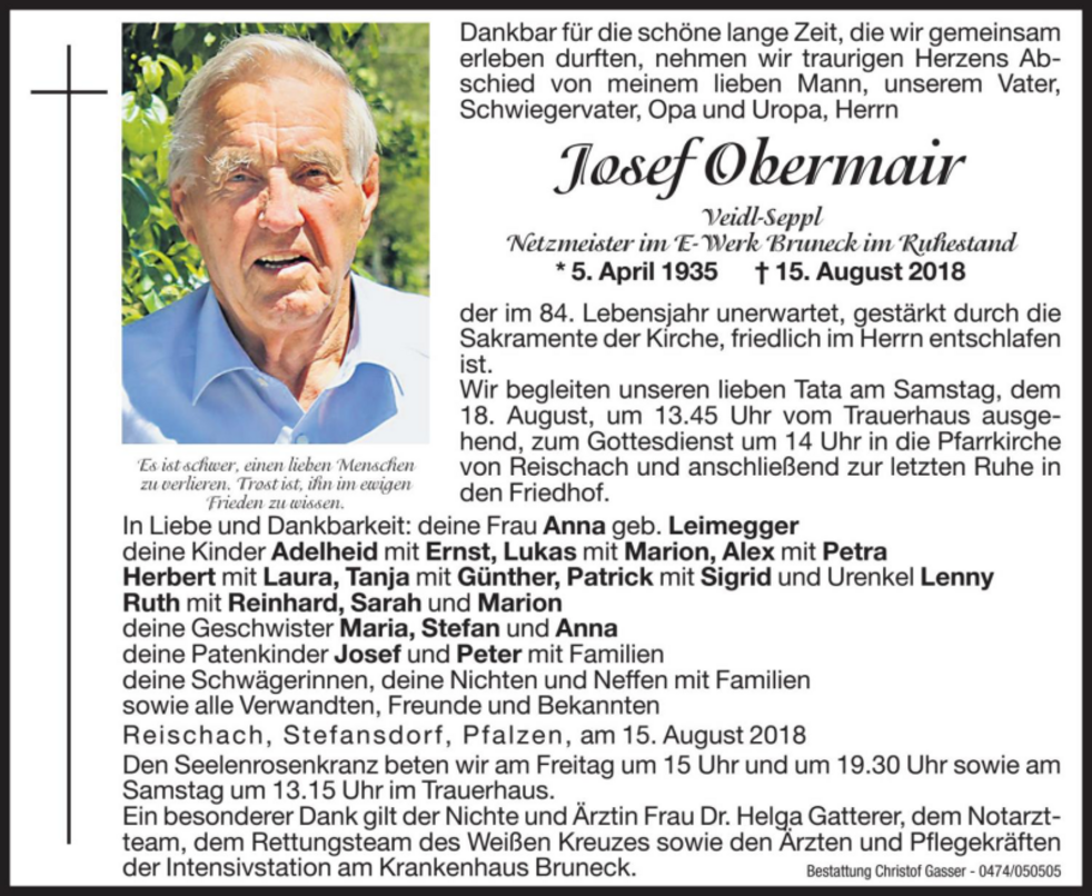 Wir begleiten unseren lieben Tata am Samstag, dem 18. August, um 13.45 Uhr vom Trauerhaus ausgehend, zum Gottesdienst um 14 Uhr in die Pfarrkirche von Reischach und anschließend zur letzten Ruhe in den Friedhof.