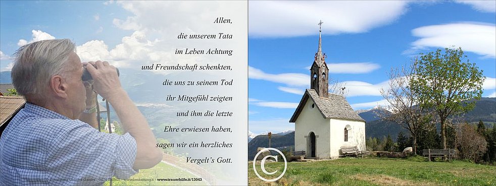 Vergelt‘s Gott allen, die an den Seelenrosenkränzen und an der Beerdigung von unserem lieben Tata teilnehmen und ihn in guter Erinnerung behalten.