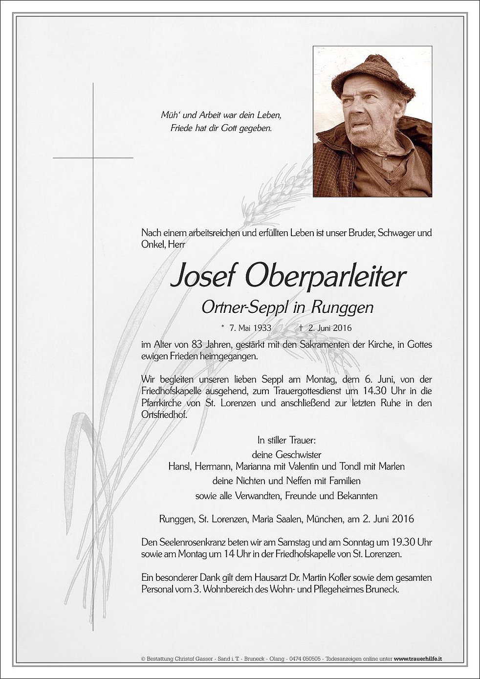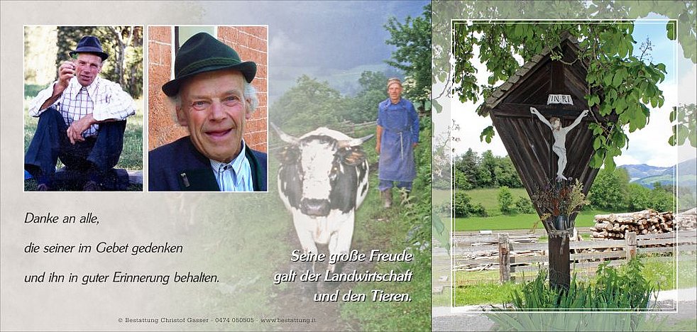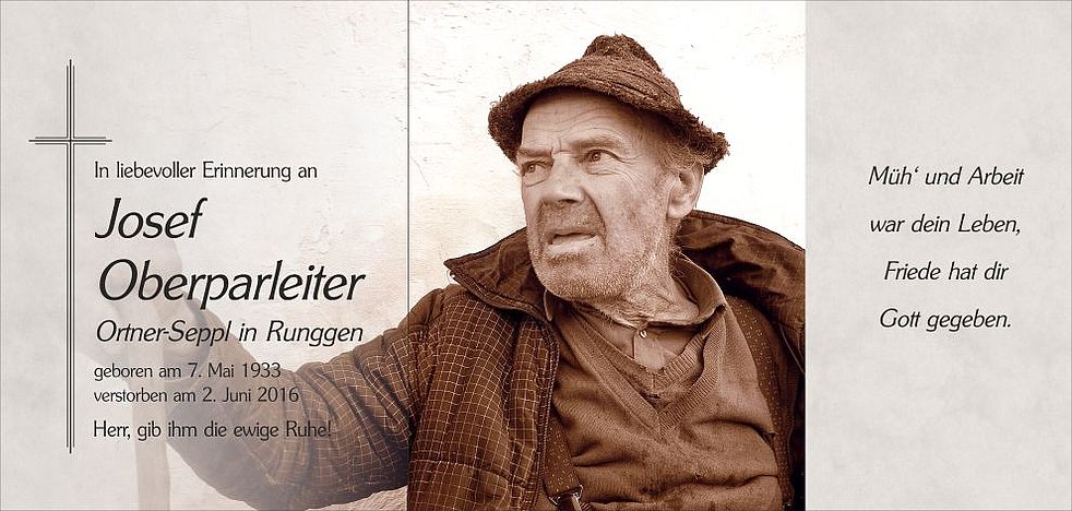 Wir begleiten unseren lieben Seppl am Montag, dem 6. Juni, von der Friedhofskapelle ausgehend, zum Trauergottesdienst um 14.30 Uhr in die Pfarrkirche von St. Lorenzen und anschließend zur letzten Ruhe in den Ortsfriedhof.