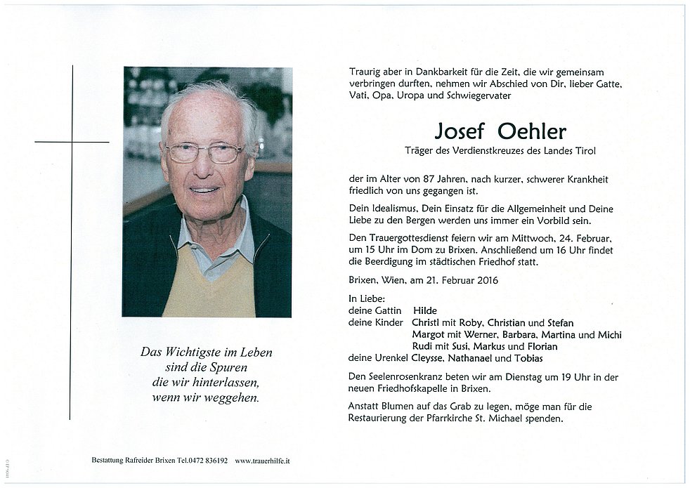 Den Trauergottesdienst feiern wir am Mittwoch, 24. Februar, um 15 Uhr im Dom zu Brixen. Anschließend um 16 Uhr findet