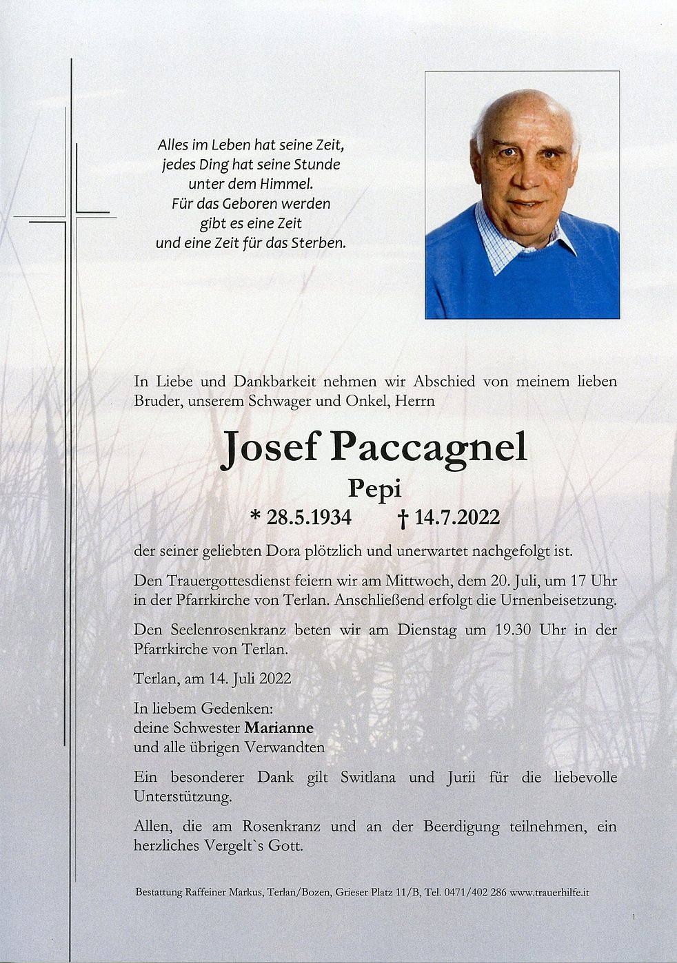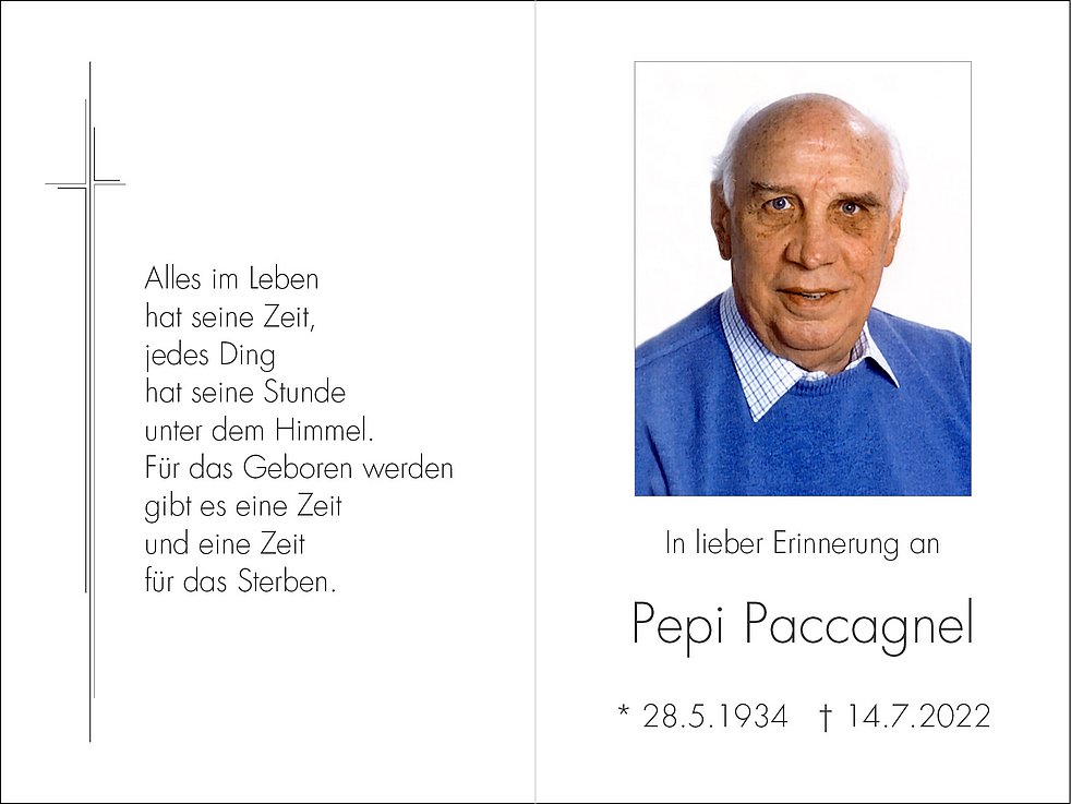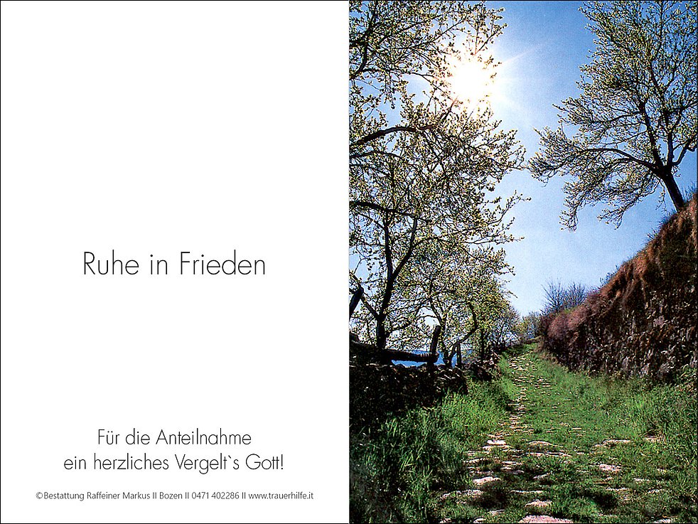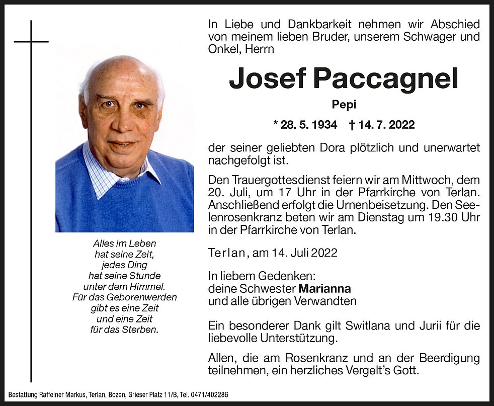 Den Trauergottesdienst feiern wir am Mittwoch, dem 20. Juli, um 17 Uhr in der Pfarrkirche von Terlan. Anschließend erfolgt die Urnenbeisetzung.