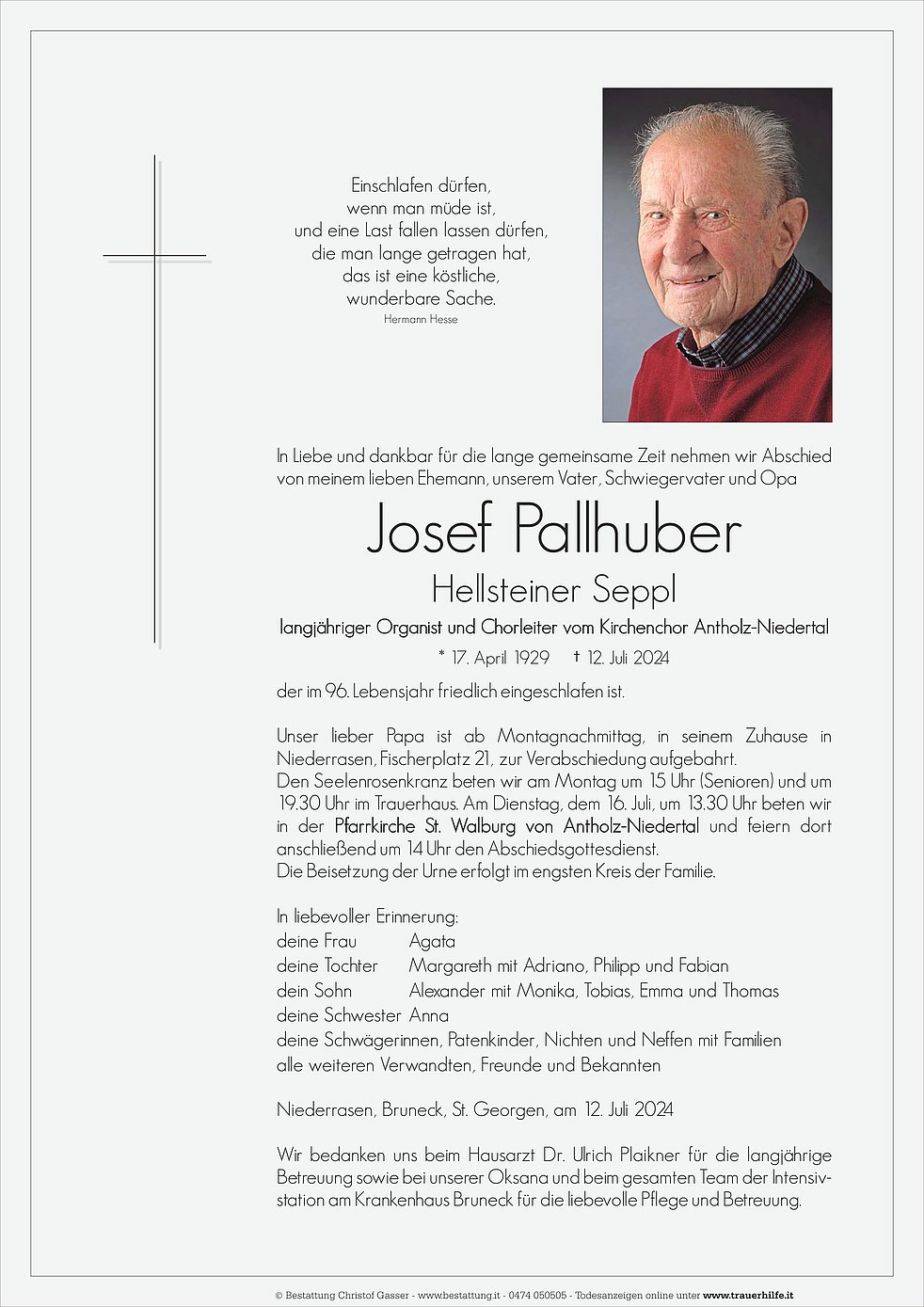 Den Seelenrosenkranz beten wir am Montag um 15 Uhr (Senioren) und um 19.30 Uhr im Trauerhaus. Am Dienstag, dem 16. Juli, um 13.30 Uhr beten wir in der Pfarrkirche St. Walburg von Antholz-Niedertal und feiern dort anschließend um 14 Uhr den Abschiedsgottesdienst.