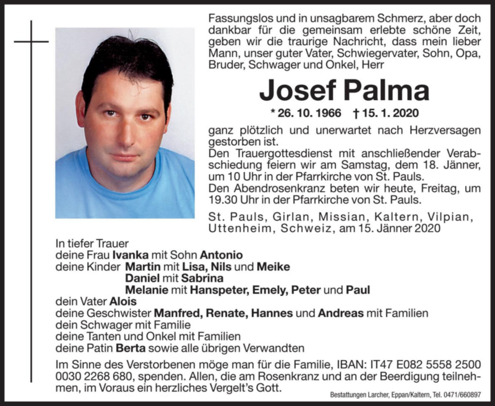 Im Sinne des Verstorbenen möge man für die Familie, IBAN: IT47E 08255 58250 000302268680 spenden.