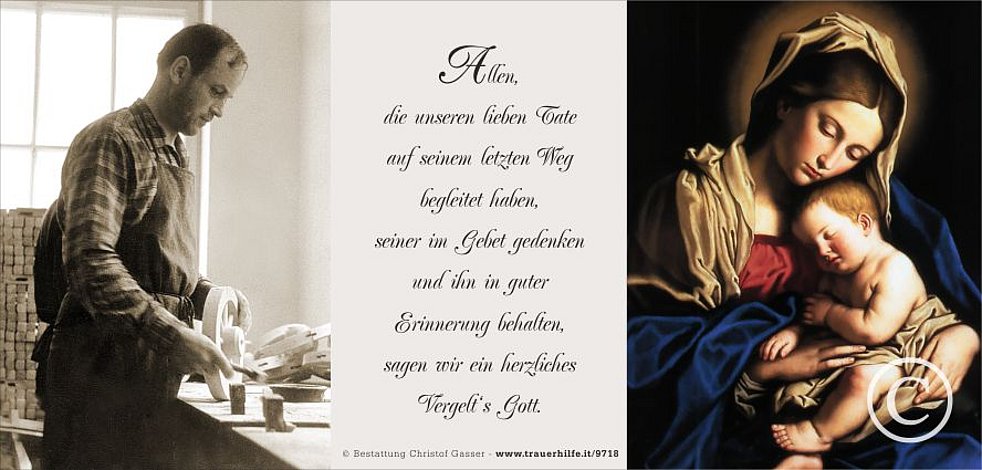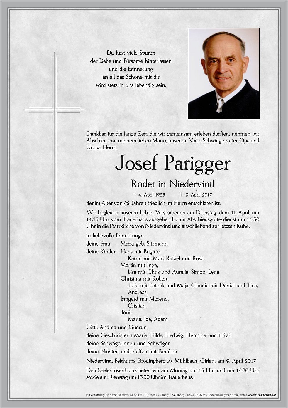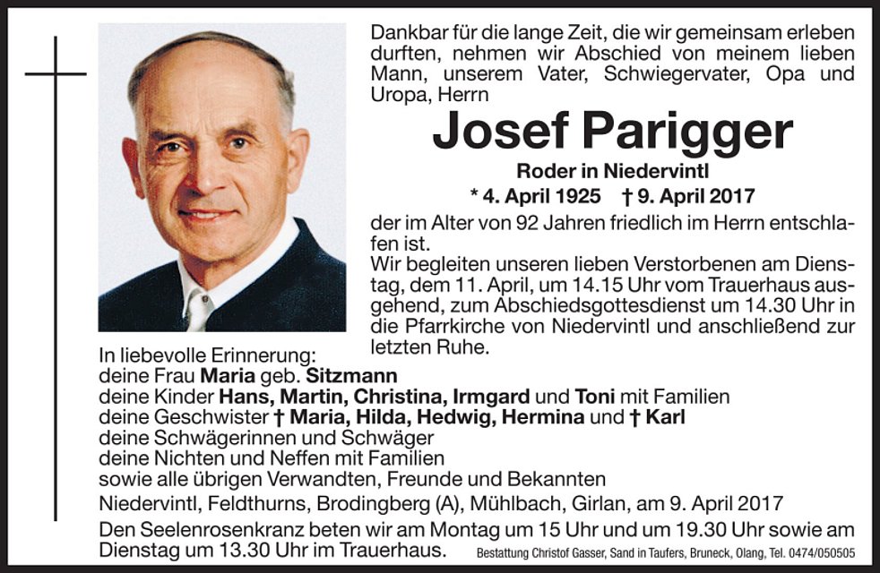 Wir begleiten unseren lieben Verstorbenen am Dienstag, dem 11. April, um 14.15 Uhr vom Trauerhaus ausgehend, zum Abschiedsgottesdienst um 14.30 Uhr in die Pfarrkirche von Niedervintl und anschließend zur letzten Ruhe.