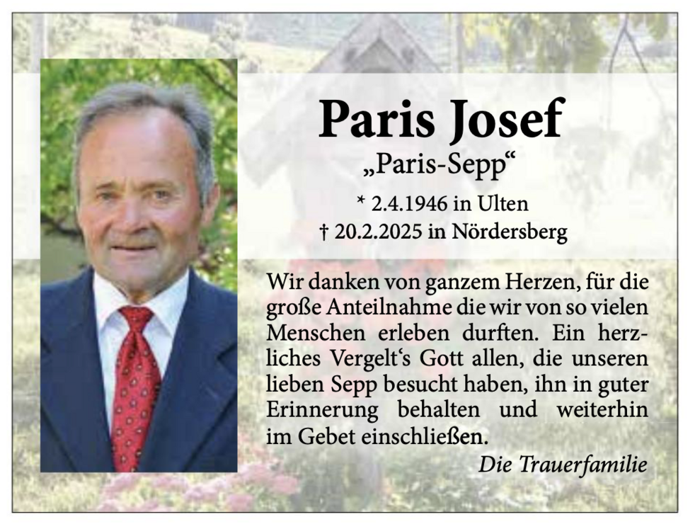 Liebe Trauerfamilie Paris, wir drücken euch unser aufrichtiges Mitgefühl und unser herzliches Beileid aus.