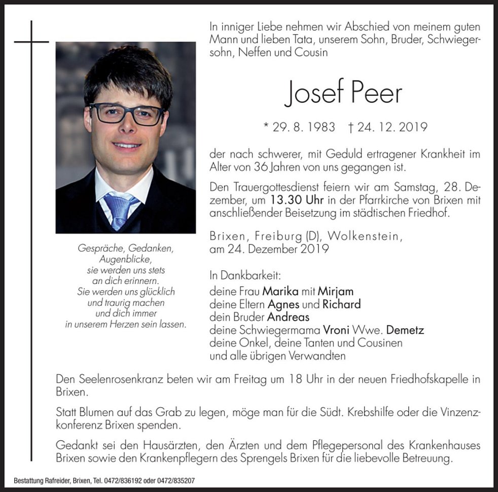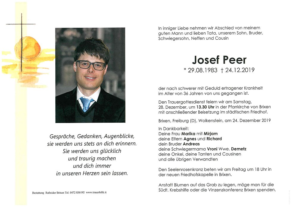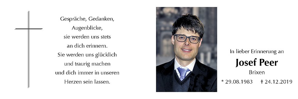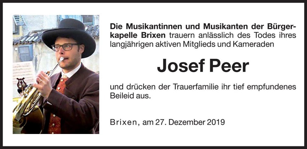 Den Trauergottesdienst feiern wir am Samstag, 28. Dezember, um 13.30 Uhr in der Pfarrkirche von Brixen mit anschließender Beisetzung im städtischen Friedhof.
