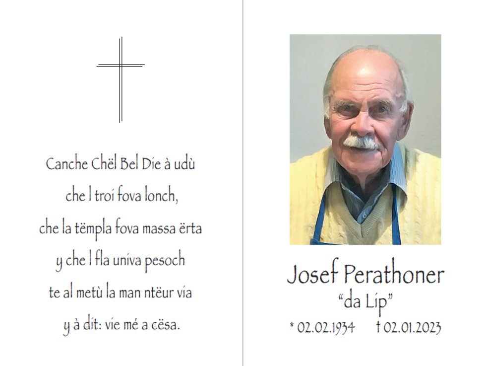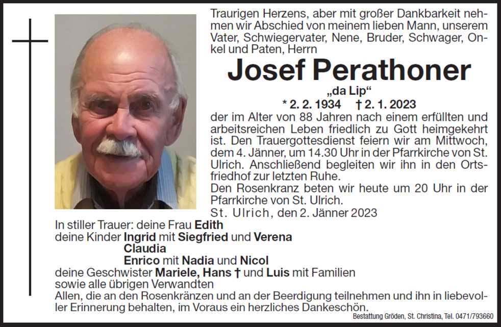Den Trauergottesdienst feiern wir am Mittwoch, dem 4. Jänner 2023, um 14.30 Uhr in der Pfarrkirche von St. Ulrich. Anschließend begleiten wir ihn in den Ortsfriedhof zur letzten Ruhe.
