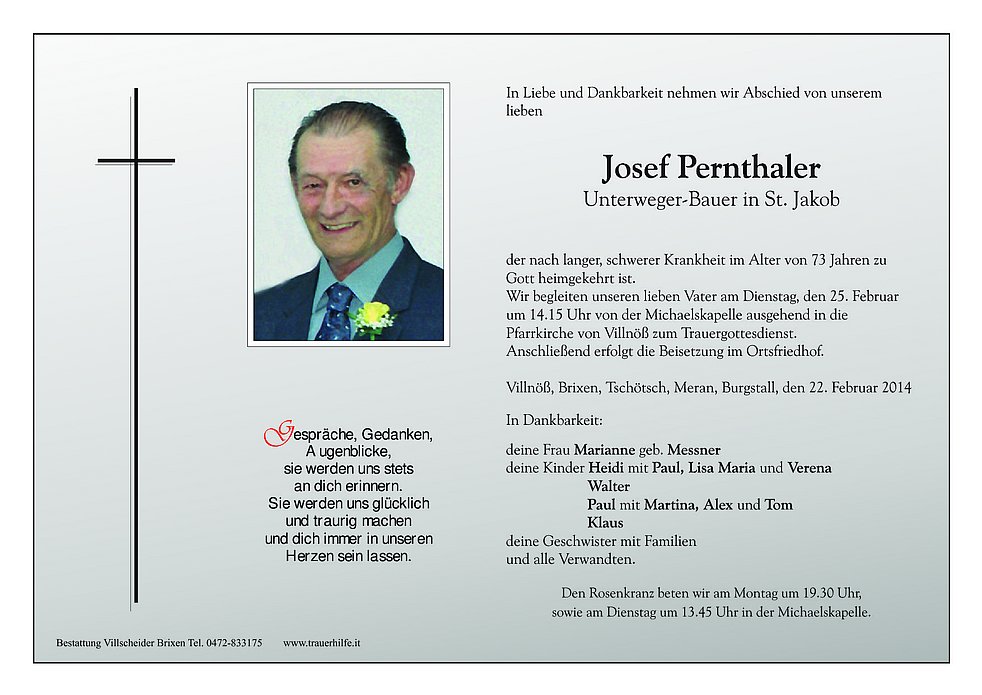 um 14.15 Uhr von der Michaelskapelle ausgehend in die Pfarrkirche von Villnöß zum Trauergottesdienst.