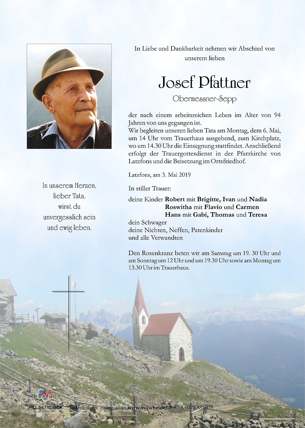 Begräbnisgottesdienst: 06.05. - 14:30 Uhr Latzfons