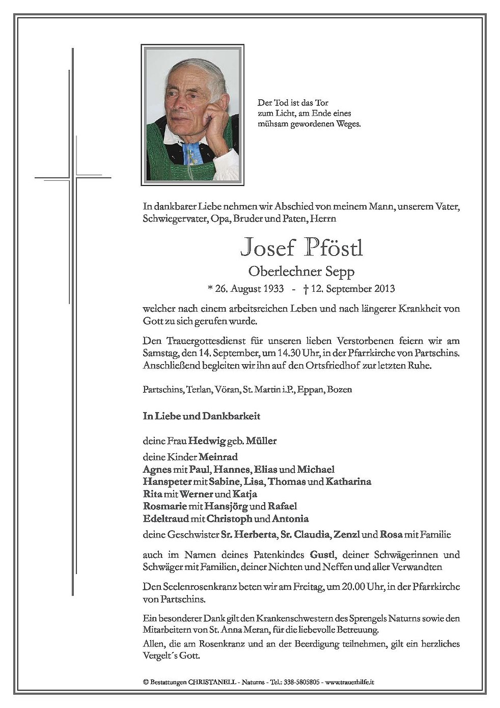 Den Trauergottesdienst für unseren lieben Verstorbenen feiern wir am Samstag, den 14. September, um 14.30 Uhr, in der Pfarrkirche von Partschins. Anschließend begleiten wir ihn auf den Ortsfriedhof zur letzten Ruhe.