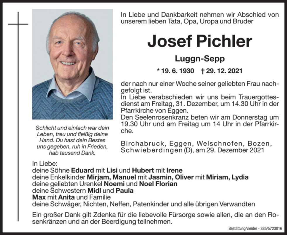 In Liebe verabschieden wir uns beim Trauergottesdienst am Freitag, 31. Dezember, um 14.30 in der Pfarrkirche von Eggen.