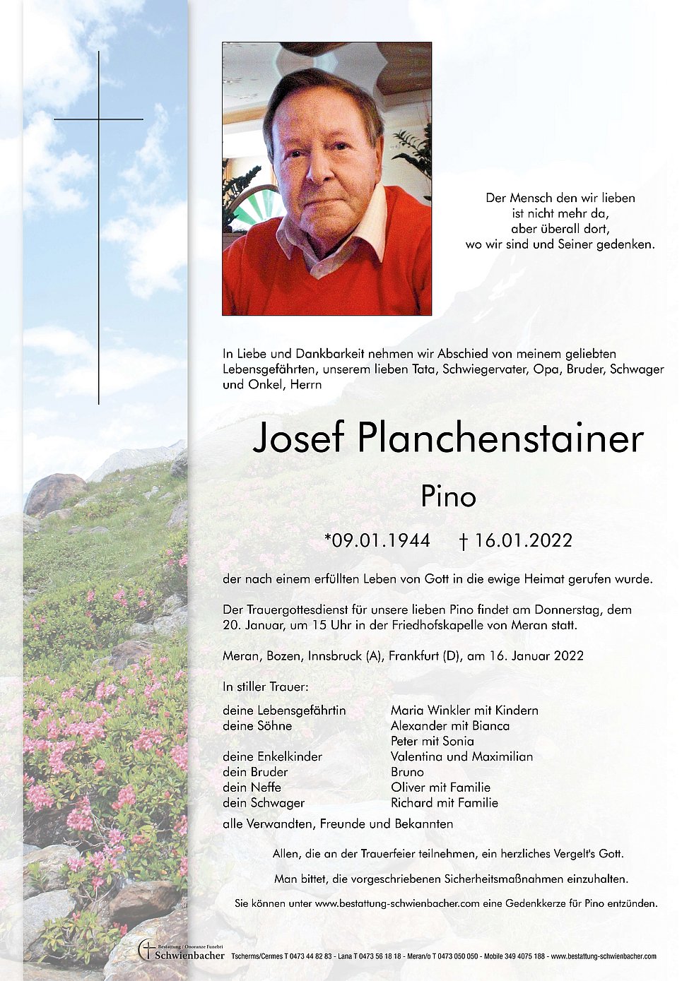 Der Trauergottesdienst für unsere lieben Pino findet am Donnerstag, dem 20. Januar, um 15 Uhr in der Friedhofskapelle von Meran statt.