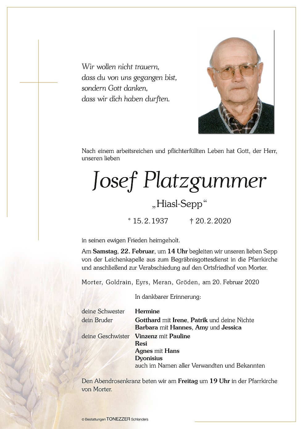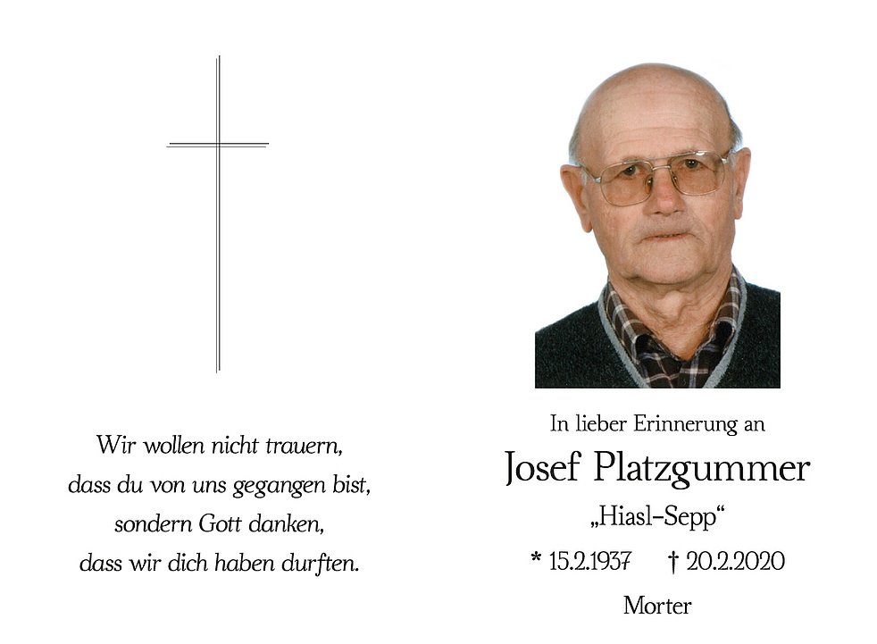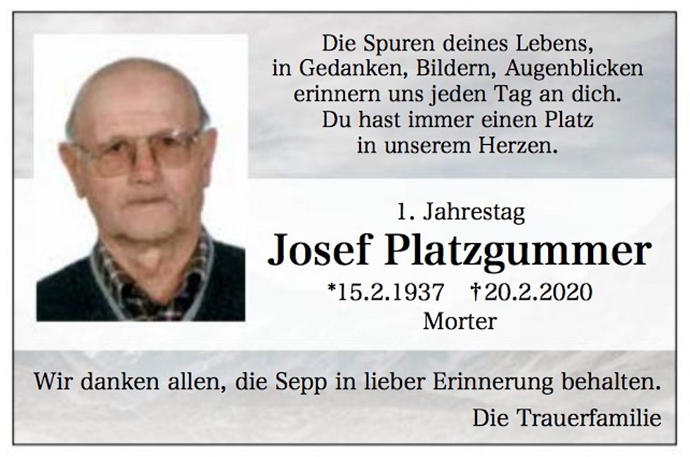 Am Samstag, 22. Februar, um 14 Uhr begleiten wir unseren lieben Sepp von der Leichenkapelle aus zum Begräbnisgottesdienst in die Pfarrkirche und anschließend zur Verabschiedung auf den Ortsfriedhof von Morter.