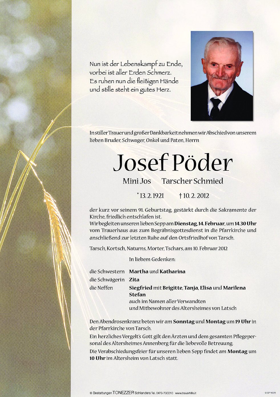 Wir begleiten unseren lieben Sepp am Dienstag, 14. Februar, um 14.30 Uhr vom Trauerhaus aus zum Begräbnisgottesdienst in die Pfarrkirche und anschließend zur letzten Ruhe auf den Ortsfriedhof von Tarsch.