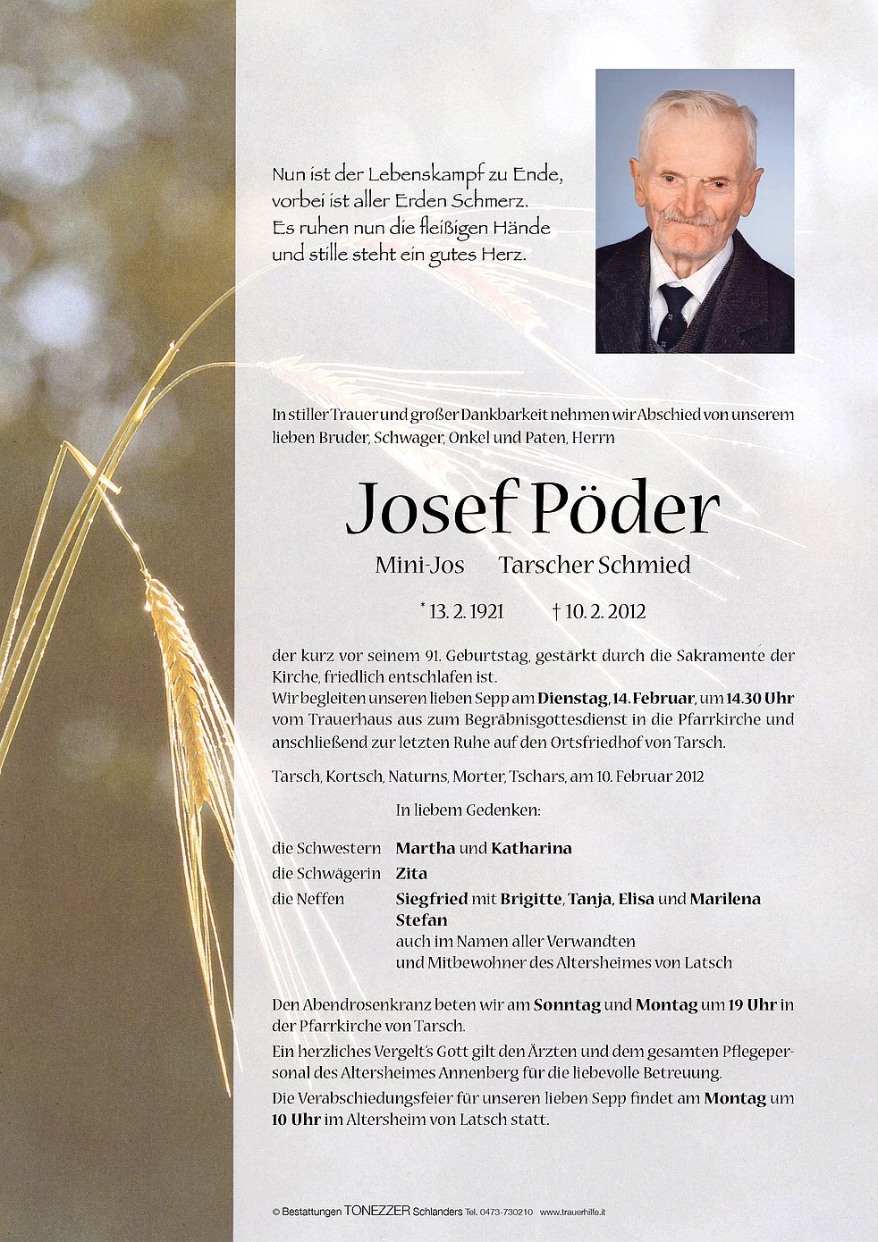 Wir begleiten unseren lieben Sepp am Dienstag, 14. Februar, um 14.30 Uhr vom Trauerhaus aus zum Begräbnisgottesdienst in die Pfarrkirche und anschließend zur letzten Ruhe auf den Ortsfriedhof von Tarsch.
