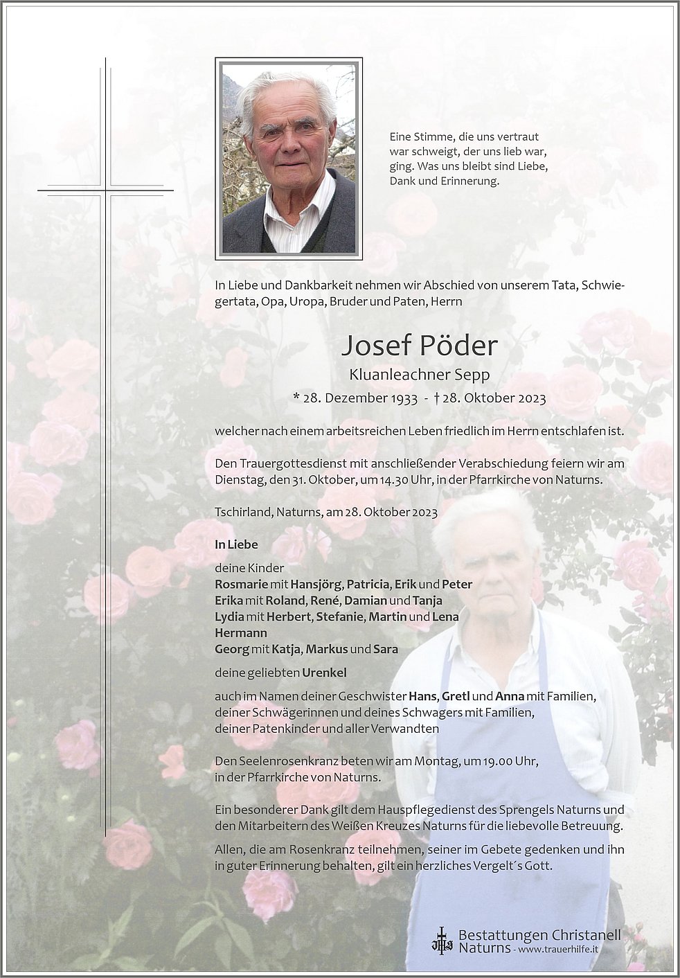 Den Trauergottesdienst mit anschließender Verabschiedung feiern wir am Dienstag, den 31. Oktober, um 14.30 Uhr, in der Pfarrkirche von Naturns.