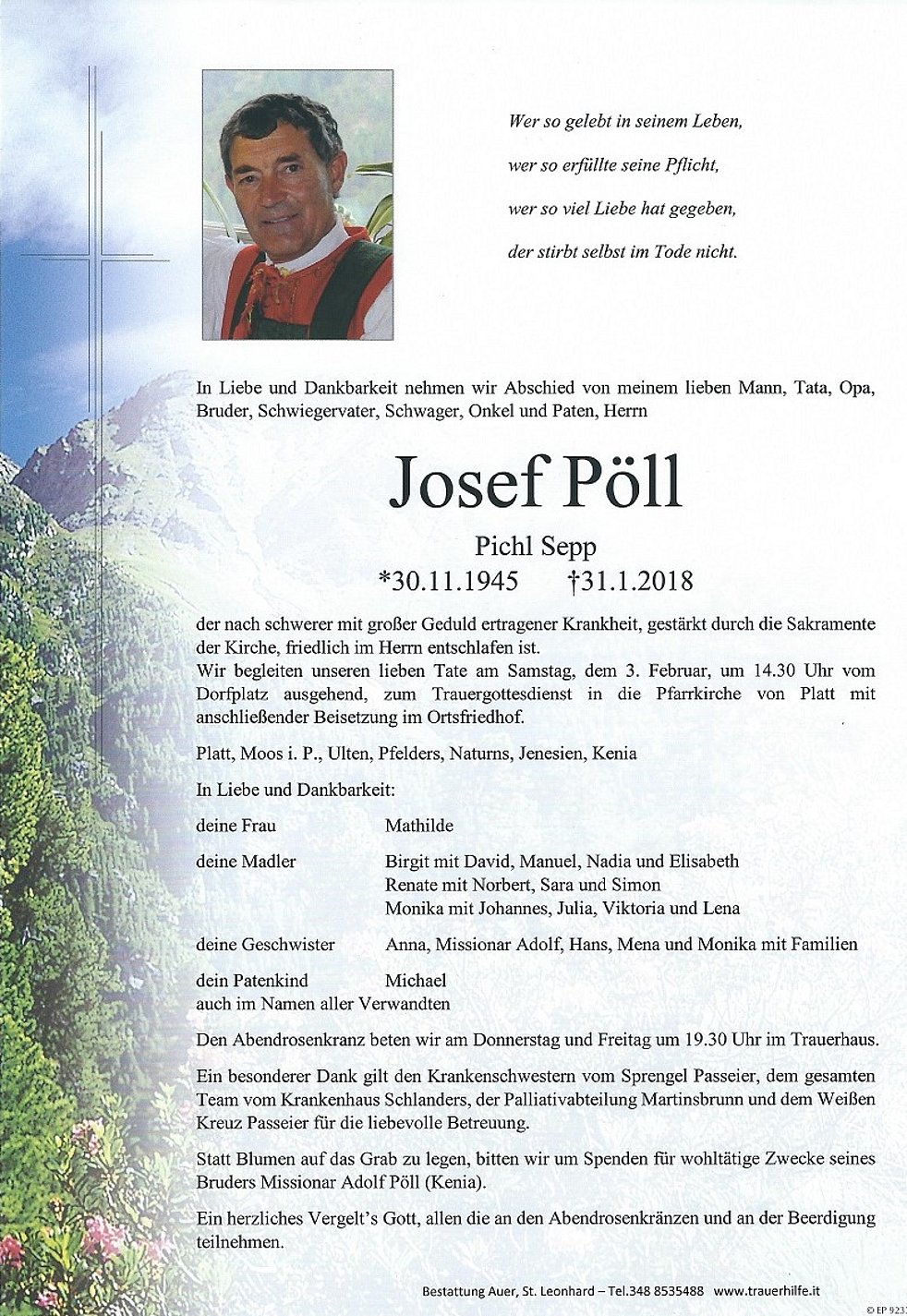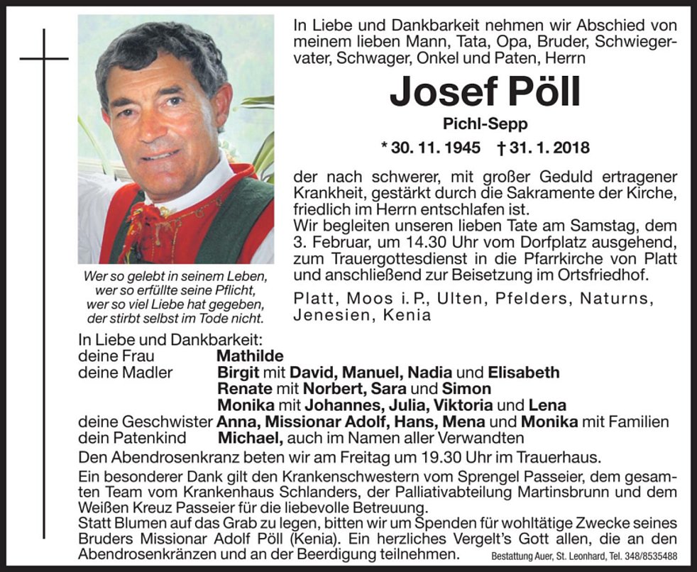 Wir begleiten unseren lieben Tate am Samstag, dem 3. Februar, um 14.30 Uhr vom Dorfplatz ausgehend, zum Trauergottesdienst in die Pfarrkirche von Platt mit anschließender Beisetzung im Ortsfriedhof.