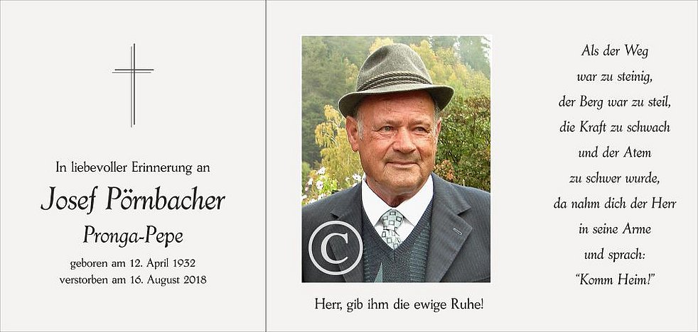 Mit dem Gefühl tiefen Dankes für all das, was er für uns war und gab, nehmen wir in Liebe Abschied von meinem lieben Mann, unserem Vati, Schwiegervater, Opa und Uropa, Herrn