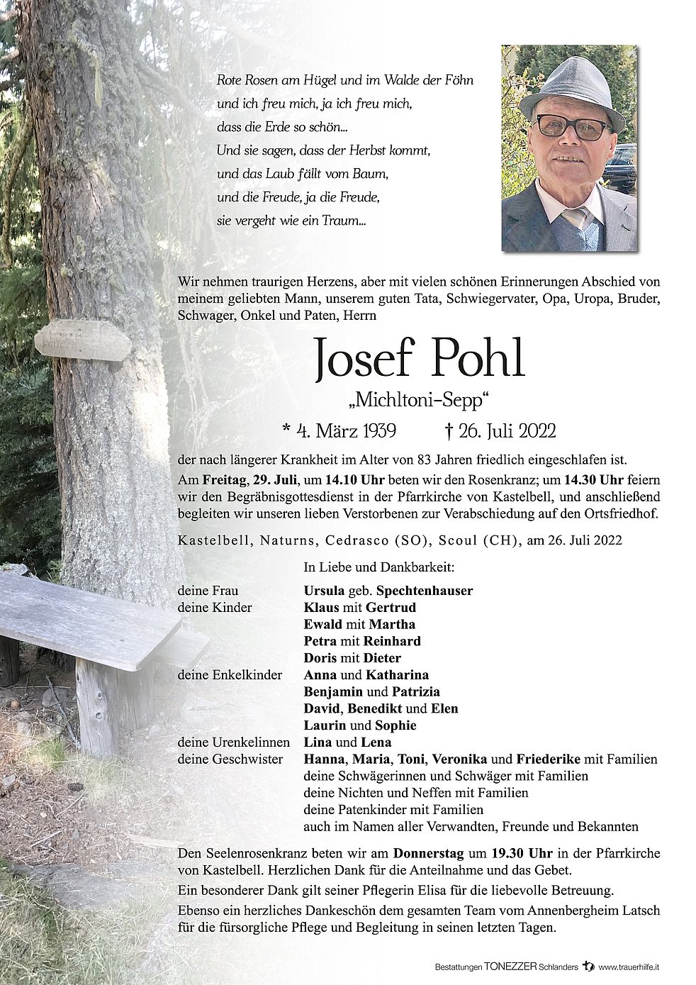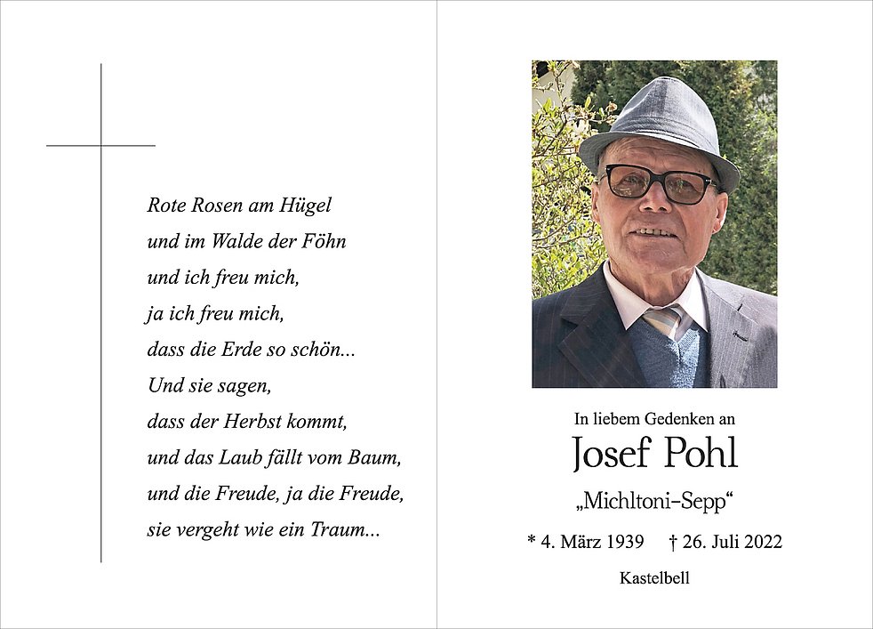 Am Freitag, 29. Juli, um 14.10 Uhr beten wir den Rosenkranz; um 14.30 Uhr feiern wir den Begräbnisgottesdienst in der Pfarrkirche von Kastelbell, und anschließend begleiten wir unseren lieben Verstorbenen zur Verabschiedung auf den Ortsfriedhof.