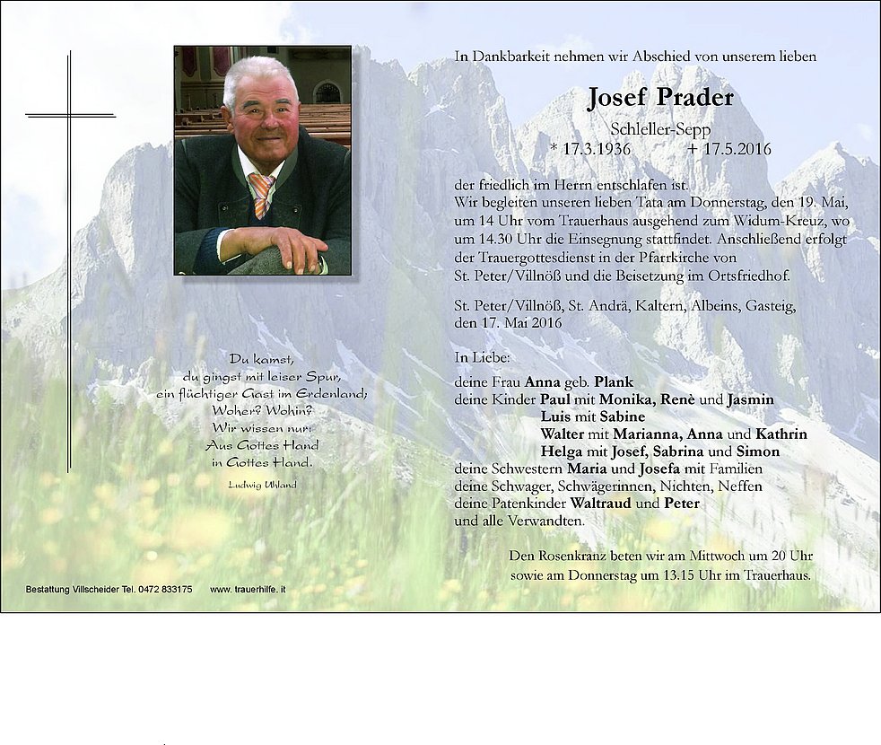 um 14 Uhr vom Trauerhaus ausgehend zum Widum-Kreuz, wo um 14.30 Uhr die Einsegnung stattfindet. Anschließend erfolgt der Trauergottesdienst in der Pfarrkirche von
