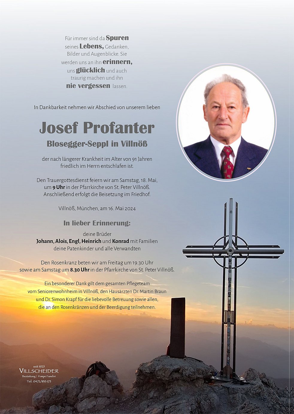 Begräbnisgottesdienst: 18.05. - 09:00 Uhr St. Peter/Villnöß