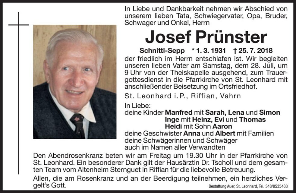 Wir begleiten unseren lieben Vater am Samstag, dem 28. Juli, um 9 Uhr von der Theiskapelle ausgehend, zum Trauergottesdienst in die Pfarrkirche von St. Leonhard mit anschließender Beisetzung im Ortsfriedhof.
