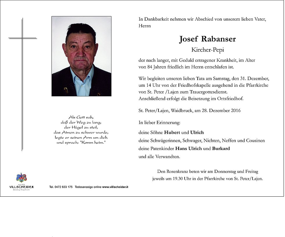 in die Pfarrkirche von St. Peter /Lajen zum Trauergottesdienst.