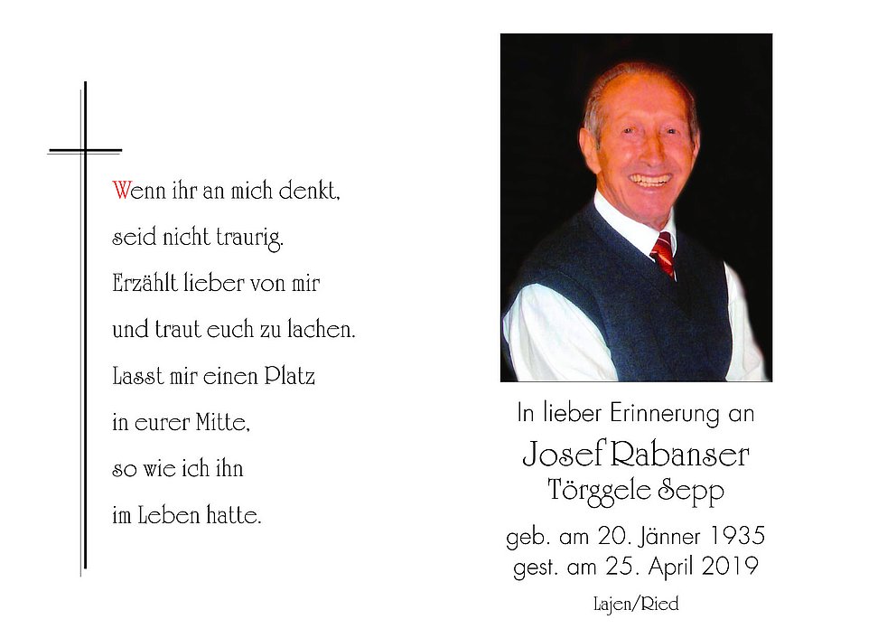Begräbnisgottesdienst: 29.04. - 14:30 Uhr Lajen