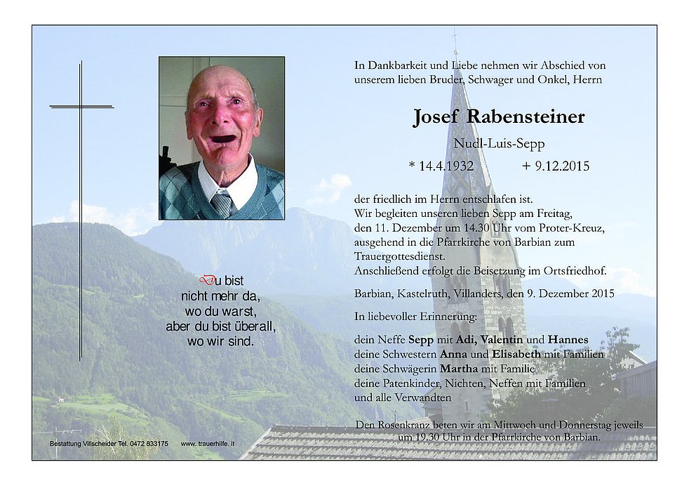 den 11. Dezember um 14.30 Uhr vom Proter-Kreuz, ausgehend in die Pfarrkirche von Barbian zum Trauergottesdienst.
