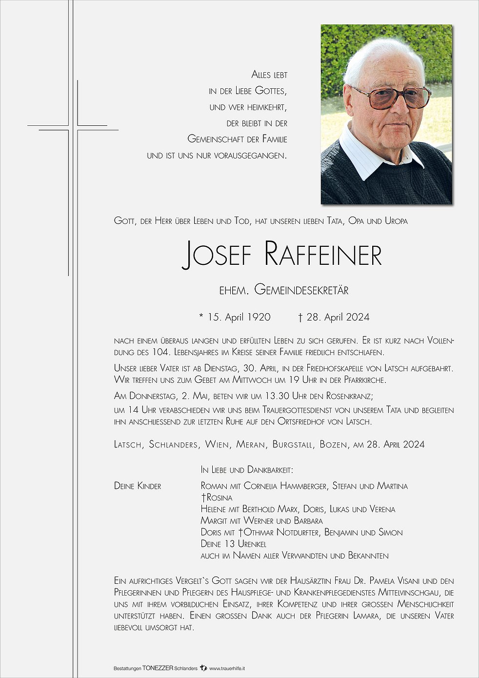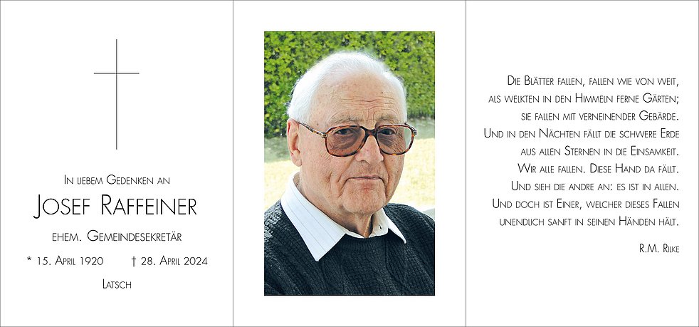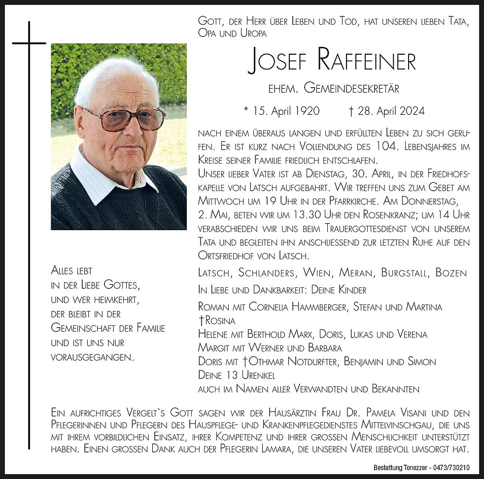 Am Donnerstag, 2. Mai, beten wir um 13.30 Uhr den Rosenkranz; um 14 Uhr verabschieden wir uns beim Trauergottesdienst von unserem Tata und begleiten ihn anschließend zur letzten Ruhe auf den Ortsfriedhof von Latsch.