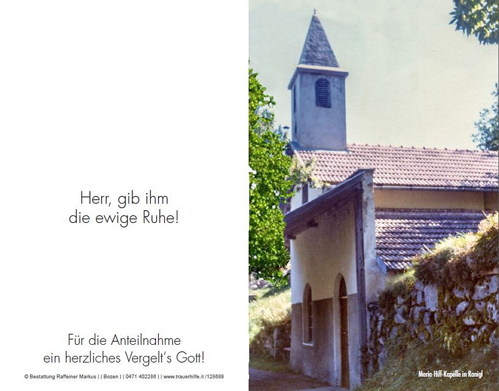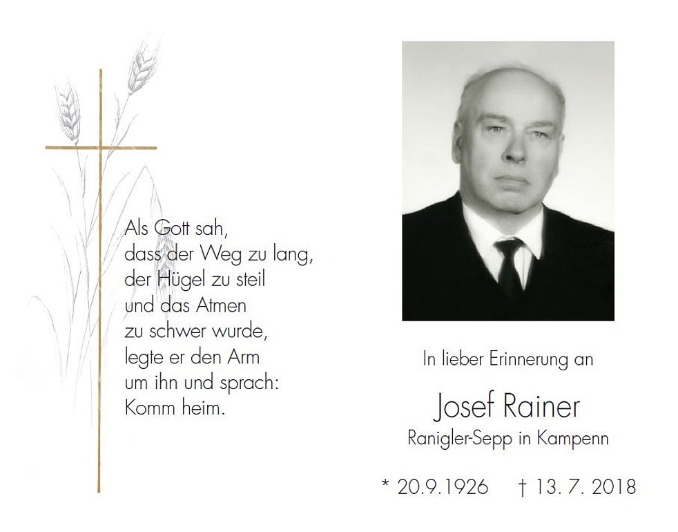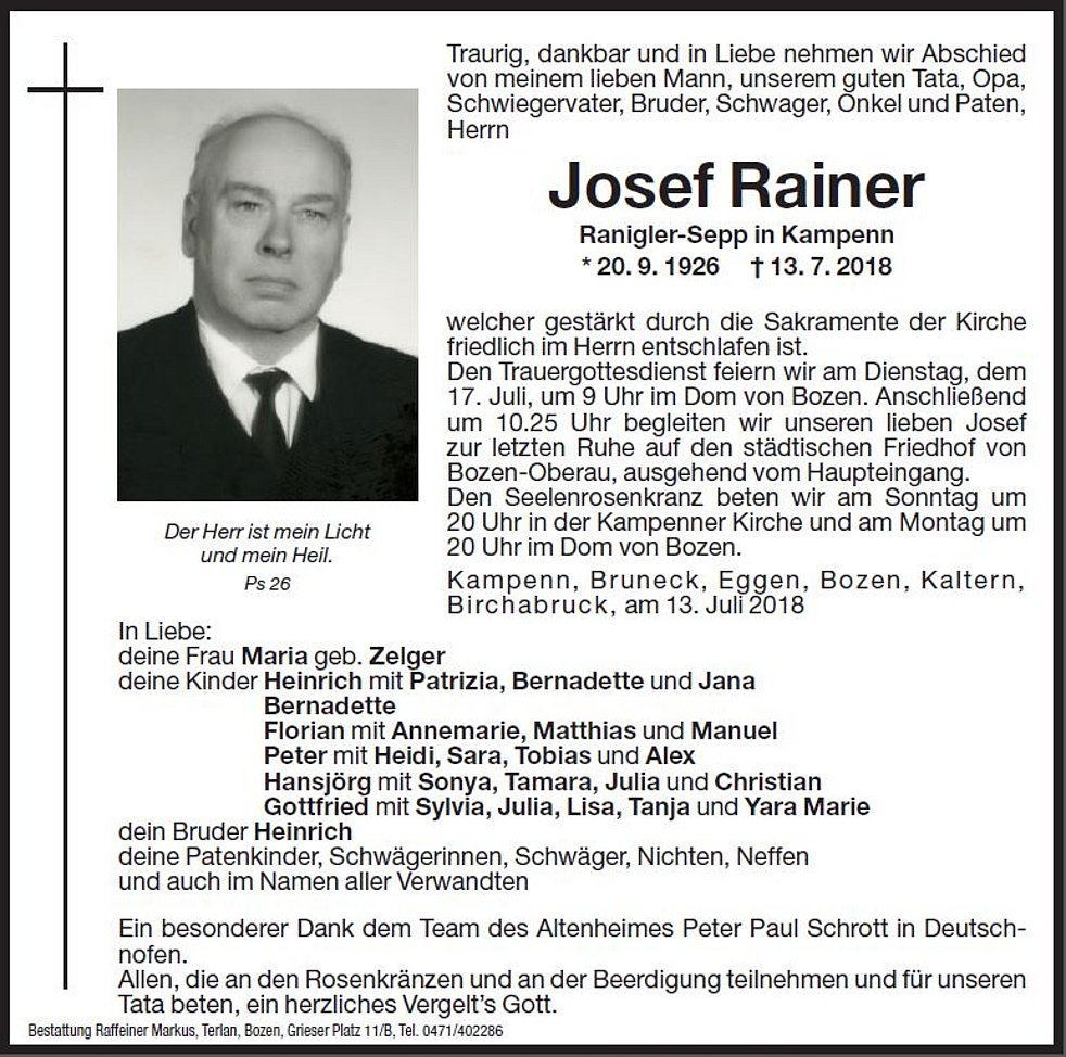 Den Trauergottesdienst feiern wir am Dienstag, dem 17. Juli, um 9 Uhr im Dom von Bozen. Anschlieβend um 10.25 Uhr begleiten wir unseren lieben Josef zur letzten Ruhe auf den städtischen Friedhof von Bozen-Oberau, ausgehend vom Haupteingang.