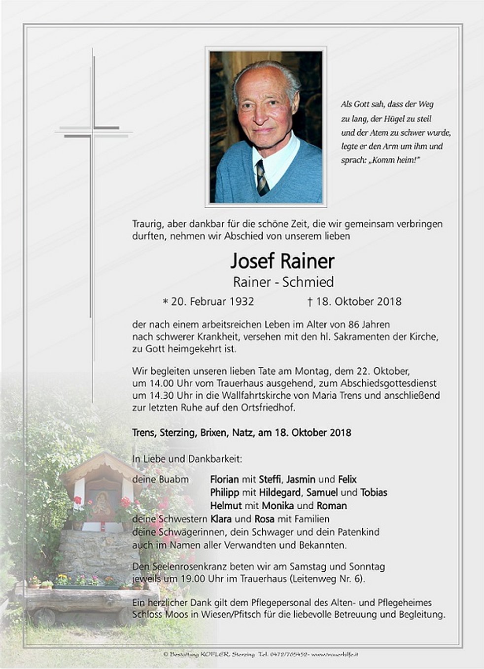 Wir begleiten unseren lieben Tate am Montag, dem 22. Oktober, um 14.00 Uhr vom Trauerhaus ausgehend, zum Abschiedsgottesdienst um 14.30 Uhr in die Wallfahrtskirche von Maria Trens und anschließend zur letzten Ruhe auf den Ortsfriedhof.