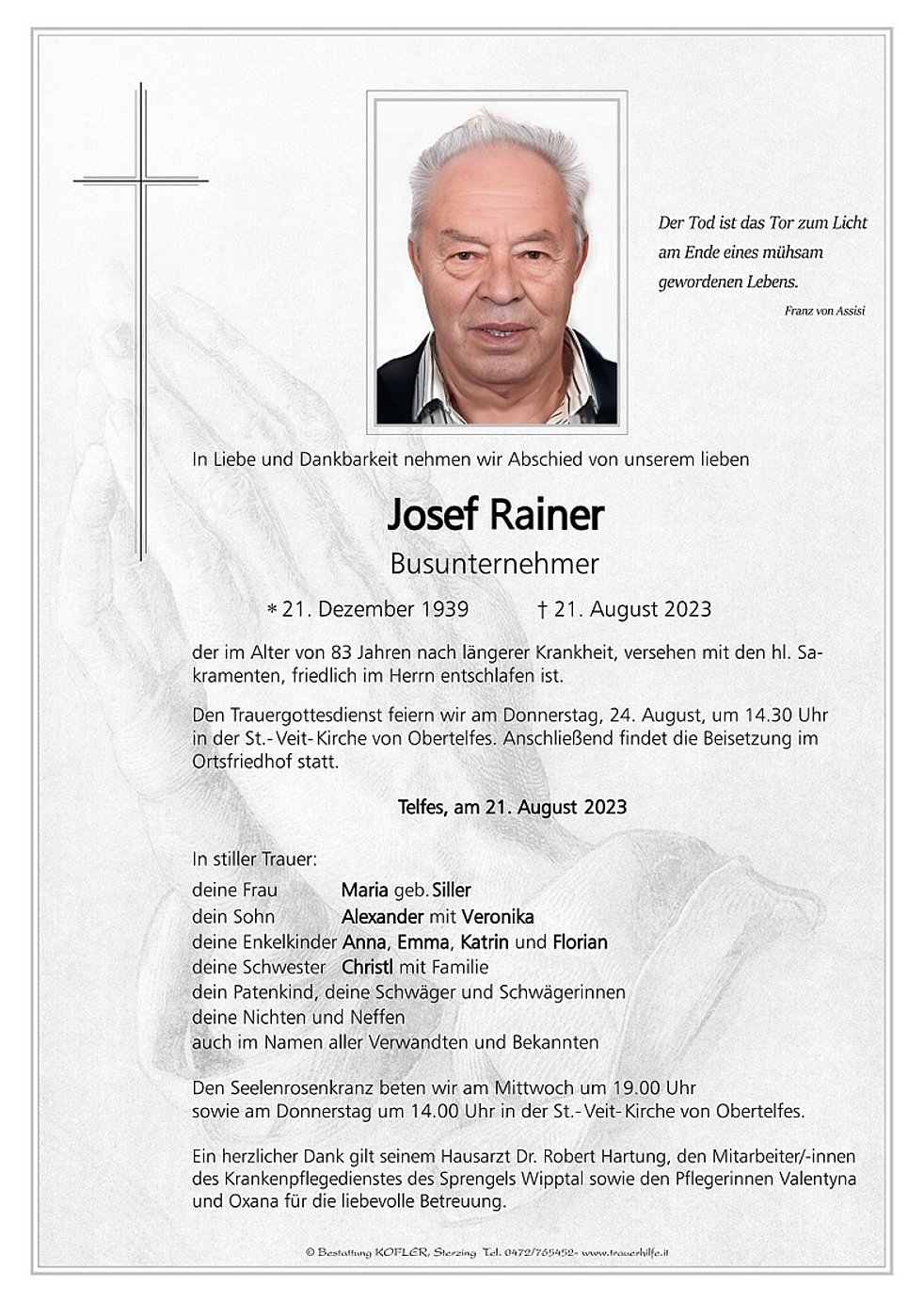 Ein herzlicher Dank gilt seinem Hausarzt Dr. Robert Hartung, den Mitarbeiter/-innen des Krankenpflegedienstes des Sprengels Wipptal sowie den Pflegerinnen Valentyna und Oxana für die liebevolle Betreuung.
