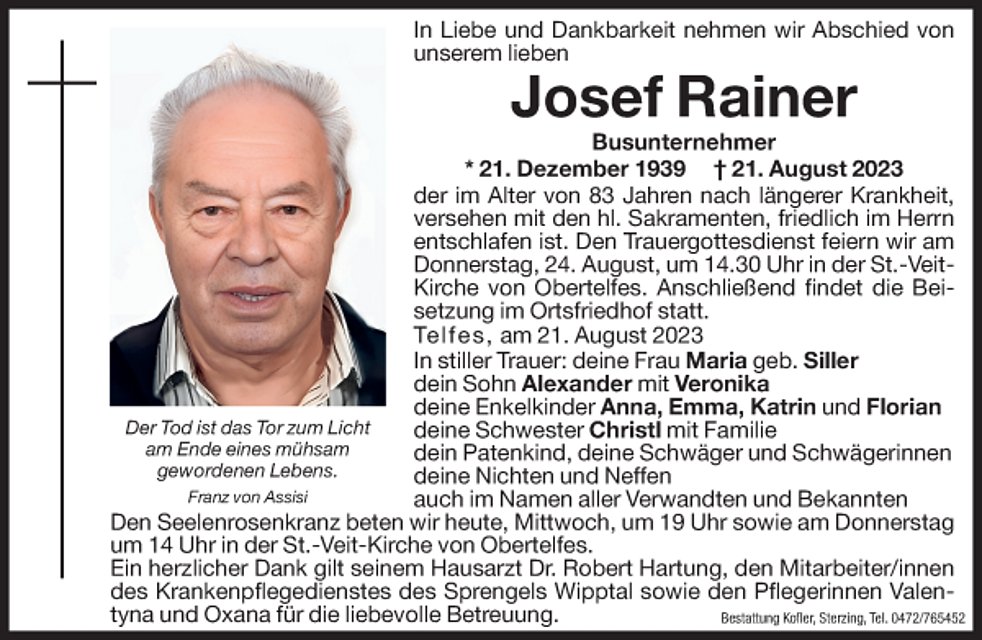 Den Trauergottesdienst feiern wir am Donnerstag, 24. August, um 14.30 Uhr in der St.- Veit- Kirche von Obertelfes. Anschließend findet die Beisetzung im Ortsfriedhof statt.