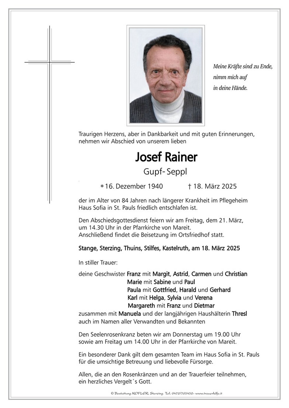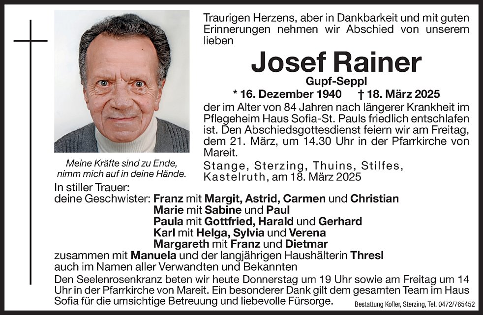 Den Abschiedsgottesdienst feiern wir am Freitag, dem 21. März, um 14.30 Uhr in der Pfarrkirche von Mareit. Anschließend findet die Beisetzung im Ortsfriedhof statt.